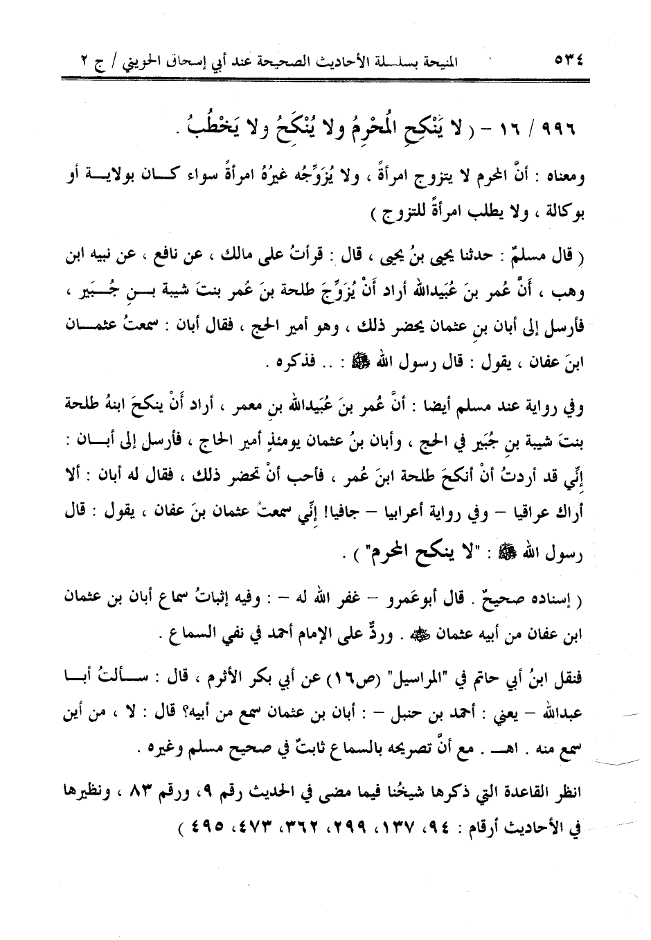 (قال مسلمٌ: حدثنا يحيى بنُ يحيى، قال: قرأتُ على مالك، عن نافع , عن نبيه ابن وهب، أَنَّ عُمر بنَ عُبَيد الله أراد أَنْ يُزَوِّجَ طلحة بنَ عُمر بنتَ شيبة بنِ جُبَير، فأرسل إلى أبان بنِ عثمان يحضر ذلك، وهو أمير الحج، فقال أبان: سمعت عثمان ابنَ عفان، يقول: قال رسول الله - صلى الله عليه وسلم -: .. فذكره.