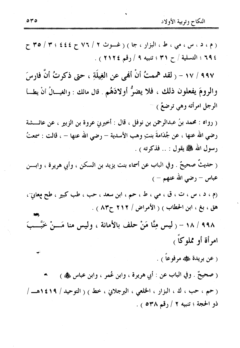 997/ 17 - (لقد هممتُ أنْ أنهى عن الغِيلَةِ، حتى ذكرتُ أنَّ فارسَ والرومَ يفعلون ذلك، فلا يضرُّ أولادَهُم. قال مالك: والغيالُ أنْ يطأ الرجل امرأته وهي ترضعُ).