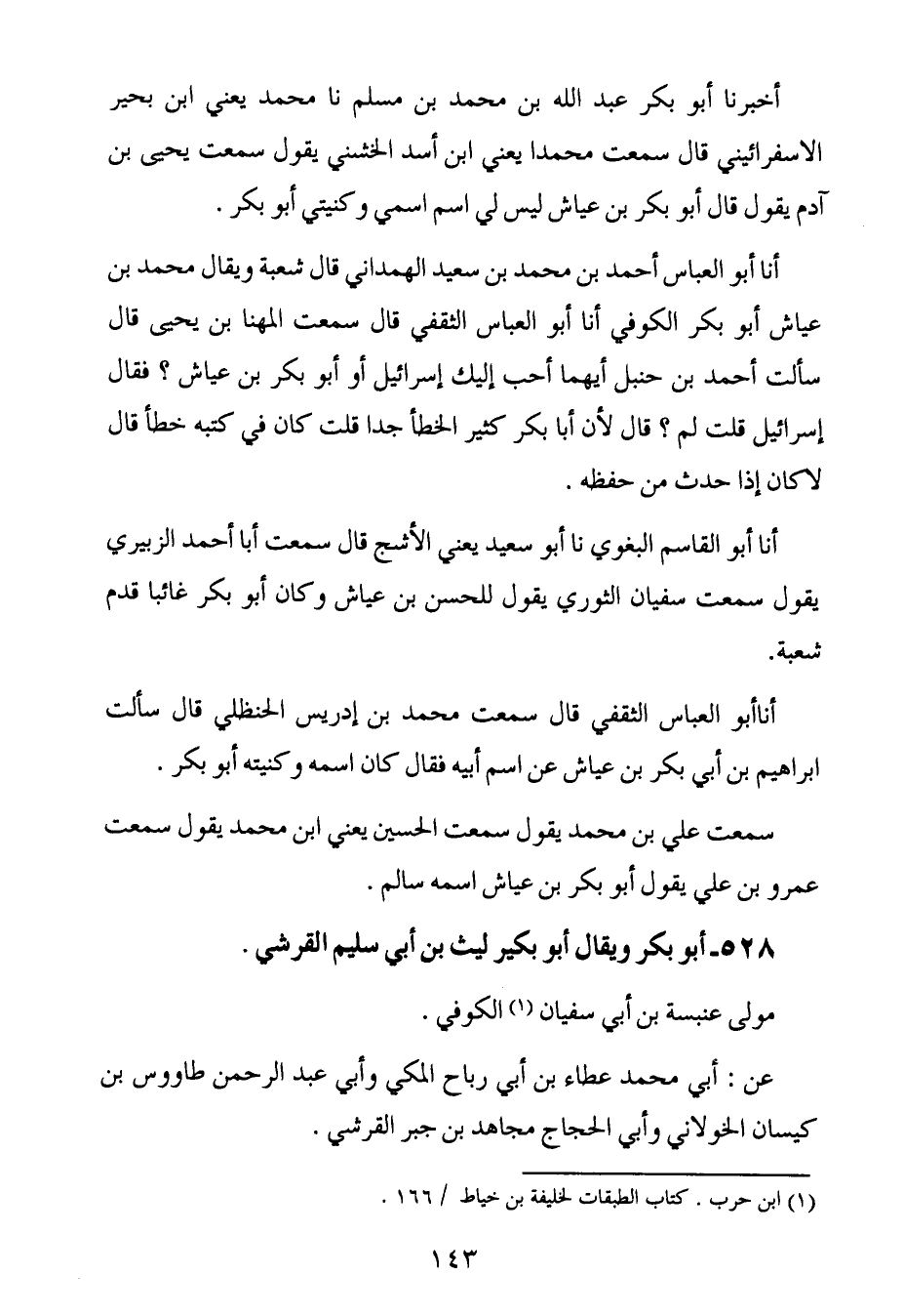 أَخْبَرنا أبو العباس الثقفي ، قال : سَمِعتُ محمد بن إدريس الحنظلي قال سألت إبراهيم بن أبي بكر بن عياش عن اسم أبيه فقال كان اسمه وكنيته أبو بكر.