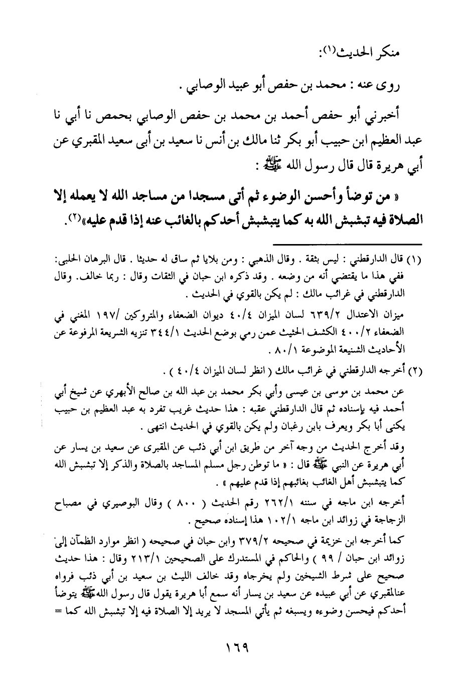 أخبرني أبو حفص أحمد بن حفص الوصابي بحمص ، حَدَّثنا أبي ، حَدَّثنا عبد العظيم بن حبيب أبو بكر ثنا مالك بن أنس ، حَدَّثنا سعيد بن أبي سعيد المقبري عن أبي هريرة ، قال : قال رسول الله صلى الله عليه وسلم : من توضأ وأحسن الوضوء ثم أتى مسجدا من مساجد الله لا يعمله إلا الصلاة فيه تبشبش الله به كما يتبشبش أحدكم بالغائب عنه إذا قدم عليه.