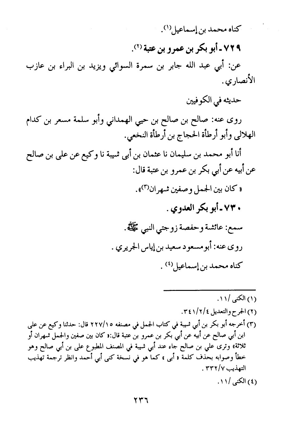 أَخْبَرنا أبو محمد بن سُليمان ، حَدَّثنا عثمان بن أبي شيبة ، حَدَّثنا وكيع عن علي بن صالح ، عَن أبيه عن أبي بكر بن عَمْرو بن عتبة قال : كان بين الجمل وصفين شهران.