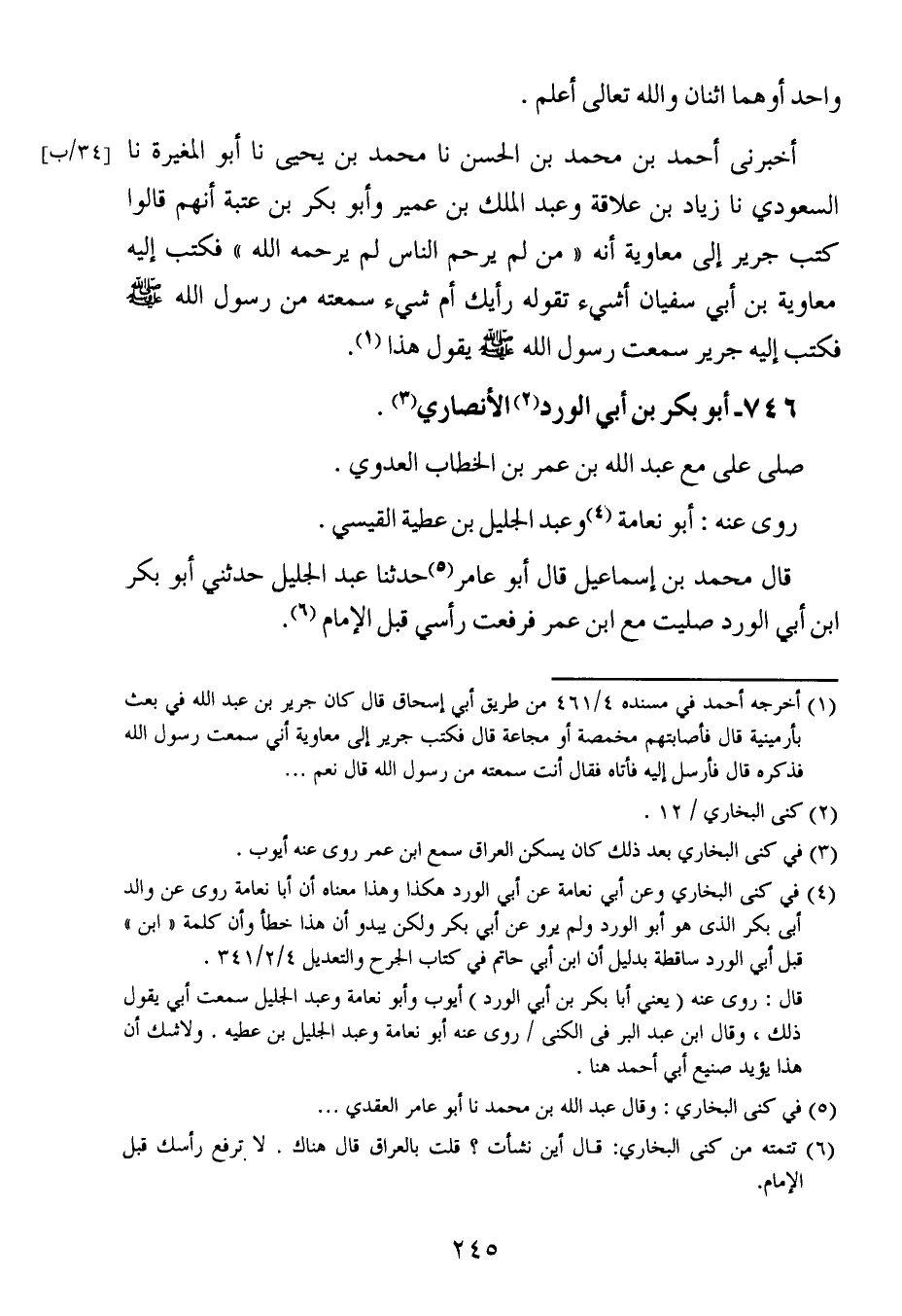 قال محمد بن إسماعيل قال أبو عامر حدثنا عبد الجليل حدثني أبو بكر بن أبي الورد صليت مع ابن عُمَر فرفعت رأسي قبل الإمام.