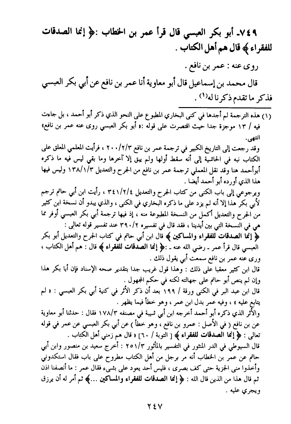 749- أبو بكر العبسي قال قرأ عُمَر بن الخطاب ( إنما الصدقات للفقراء ) قال هم أهل الكتب.