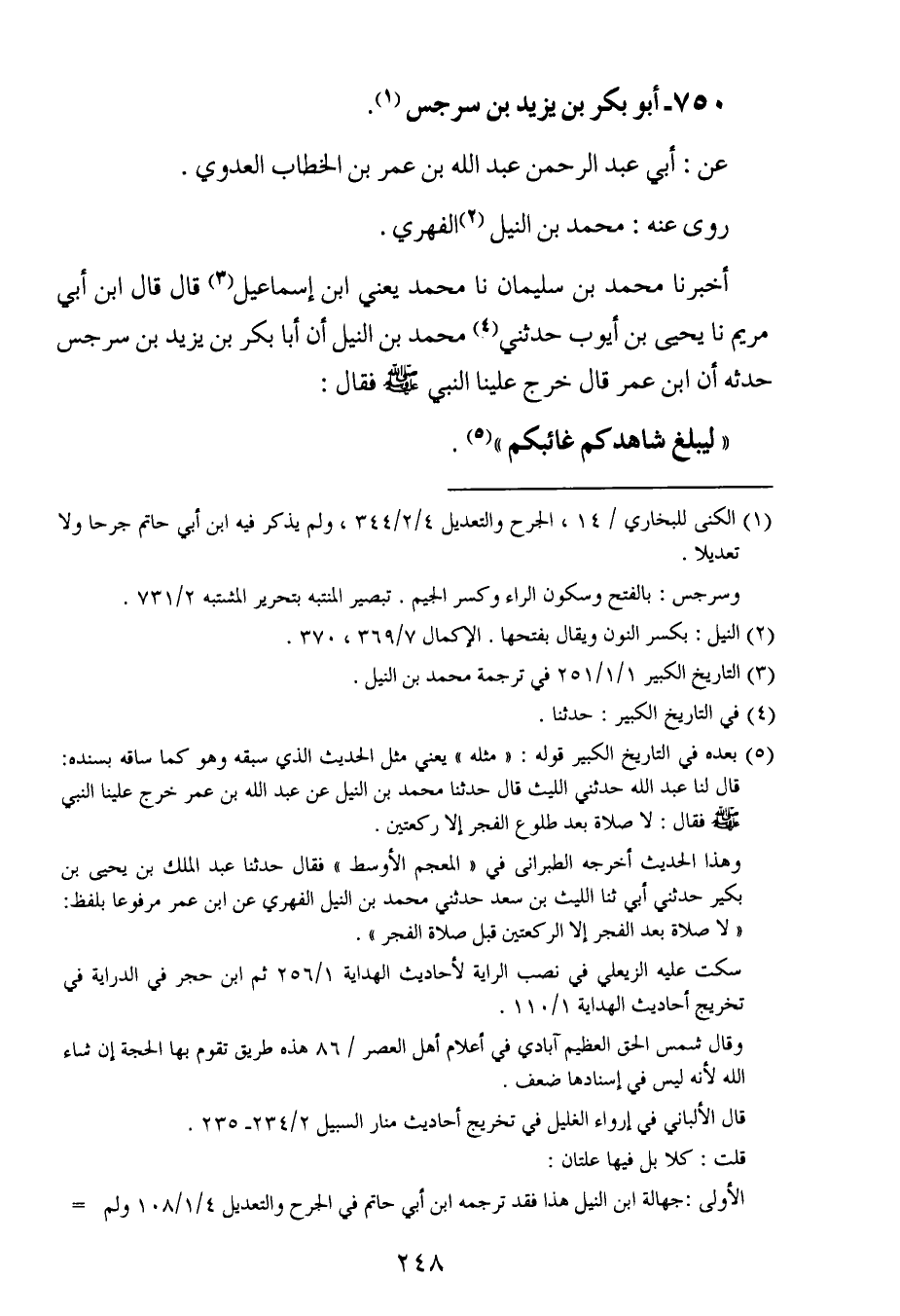 أخبرنا محمد بن سُليمان ، حَدَّثنا محمد ، يَعنِي ابن إسماعيل ، قال : قال ابن أبي مريم ، حَدَّثنا يحيى بن أيوب حدثني محمد بن النيل أن أبا بكر بن يزيد بن سرجس حدثه أن ابن عُمَر قال خرج علينا النبي صلى الله عليه وسلم فقال : ليبلغ شاهدكم غائبكم.