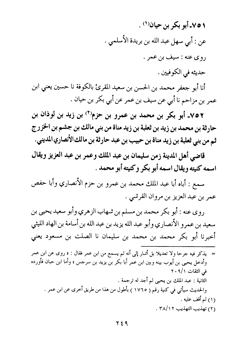 752- أبو بكر بن محمد بن عَمْرو بن حزم بن زيد بن لوذان بن حارثة بن محمد بن زيد بن ثعلبة بن زيد مناة من بني مالك بن جشم بن الخزرج ثم من بني ثعلبة بن زيد مناة بن حبيب بن عبد حارثة بن مالك الأنصاري المديني.