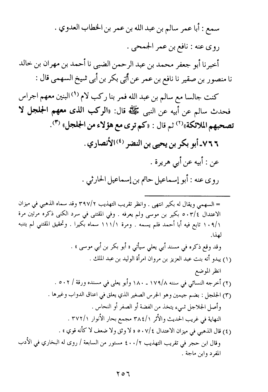 أخبرنا أبو جعفر محمد بن عبد الرحمن الضبي ، حَدَّثنا أحمد بن مهران بن خالد ، حَدَّثنا منصور بن صقير ، حَدَّثنا نافع بن عُمَر عن أبي بكر بن أبي شيخ السهمي قال : كنت جالسا مع سالم بن عبد الله فمر بنا ركب لام البنين معهم اجراس فحدث سالم ، عَن أبيه عن النبي صلى الله عليه وسلم قال : الركب الذي معهم الجلجل لا تصحبهم الملائكة ثم قال : كم ترى مع هؤلاء من الجلجل.