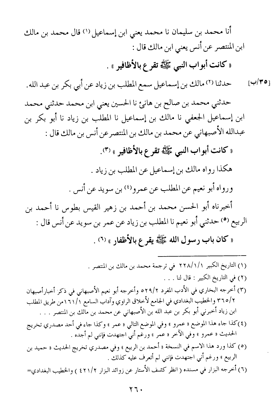 أَخْبَرنا محمد بن سُليمان ، حَدَّثنا محمد ، يَعنِي ابن إسماعيل قال محمد بن مالك بن المنتصر ، عَن أَنس بن مالك قال : كانت أبواب النبي صلى الله عليه وسلم تقرع بالأظافير.