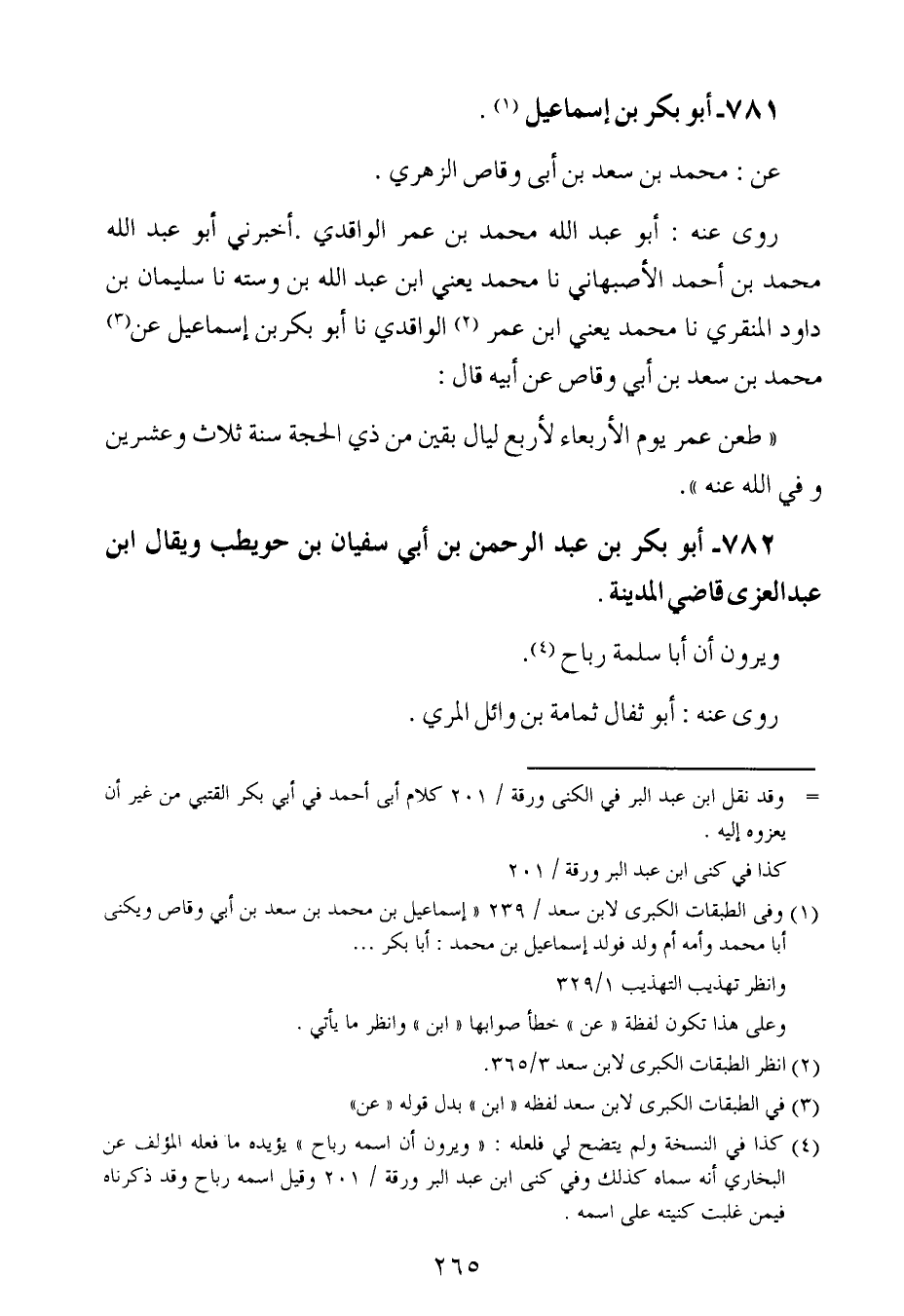 أخبرني أبو عبد الله محمد بن أحمد الأصبهاني ، حَدَّثنا محمد ، يَعنِي ابن عبد الله بن وسته ، حَدَّثنا سُليمان بن داود المنقري ، حَدَّثنا محمد ، يَعنِي ابن عُمَر الواقدي ، حَدَّثنا أبو بكر بن إسماعيل عن محمد بن سعد بن أبي وقاص ، عَن أبيه قال : طعن عُمَر يوم الأربعاء لأربع ليال بقين من ذي الحجة سنة ثلاث وعشرين وفي الله عنه.