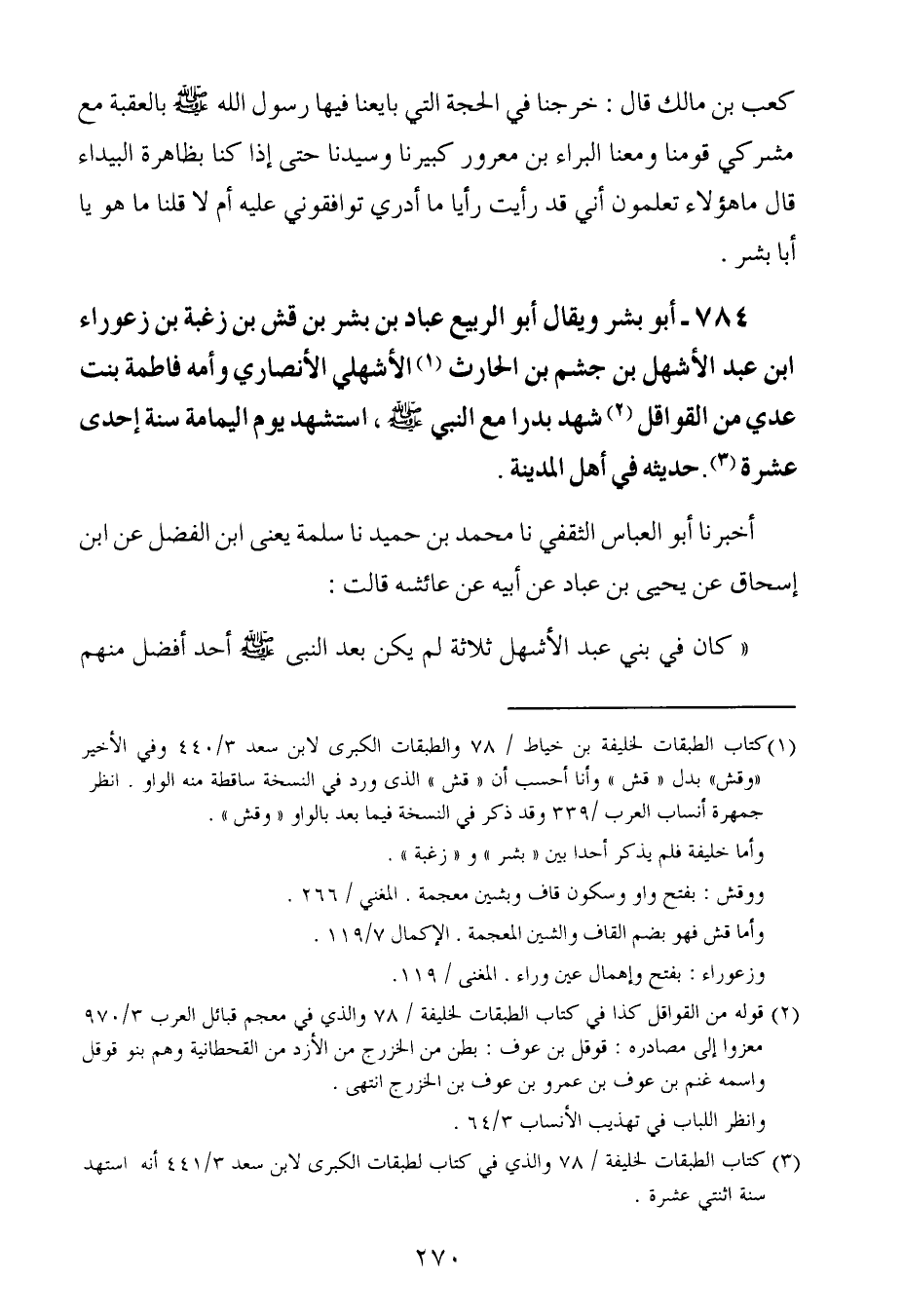 784- أبو بشر ، وَيُقَال : أبو الربيع عباد بن بشر بن قش بن زغبة بن زعوراء ابن عبد الأشهل بن جشم بن الحارث الأشهلي الأنصاري وأمه فاطمة بنت عدي من القواقل شهد بدرا مع النبي صلى الله عليه وسلم استشهد يوم اليمامة سنة إحدى عشرة حديثه في أهل المدينة.
