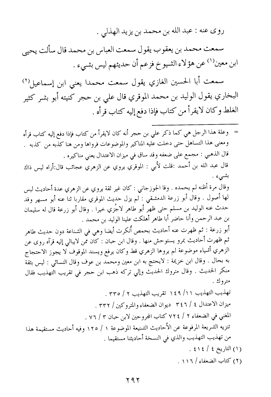 سمعت أبا الحسين الغازي يقول : سَمِعتُ محمدا ، يَعنِي ابن إسماعيل البخاري يقول الوليد بن محمد الموقري قال علي بن حجر كنيته أبو بشر كثير الغلط ، وكان لا يقرأ من كتاب فإذا دفع إليه كتاب قرأه.
