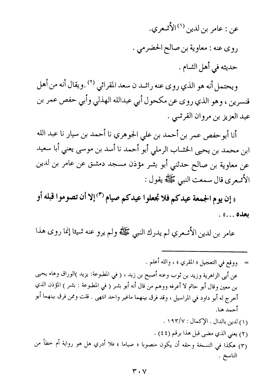 أَخْبَرنا أبو حفص عُمَر بن أحمد بن علي الجوهري ، حَدَّثنا أحمد بن سيار ، حَدَّثنا عبد الله بن محمد بن يحيى الخشاب الرملي أبو أحمد ، حَدَّثنا أسد بن موسى ، يَعني أبا سعيد عن معاوية بن صالح حدثني أبو بشر مؤذن مسجد دمشق عن عامر بن لدين الأشعري ، قال : سَمِعتُ النبي صلى الله عليه وسلم يقول : إن يوم الجمعة عيدكم فلا تجعلوا عيدكم صيام إلا أن تصوموا قبله او بعده.