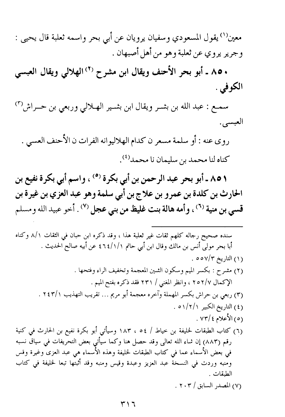 851- أبو بحر عبد الرحمن بن أبي بكرة ، وَاسْمُ أبي بكرة نفيع بن الحارث بن كلدة بن عَمْرو بن علاج بن أبي سلمة ، وَهُو عبد العزي بن غيرة بن قسي بن منية وأمه هالة بنت غليظ من بني عجل.