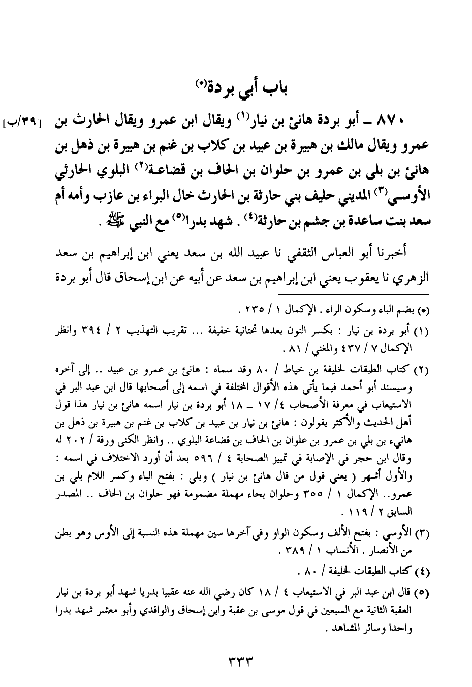 870- أبو بردة هانِئ بن نيار ، وَيُقَال : ابن عَمْرو ، وَيُقَال : الحارث بن عَمْرو ، وَيُقَال : مالك بن هبيرة بن عبيد بن كلاب بن غنم بن هبيرة بن ذهل بن هانِئ بن بلى بن عَمْرو بن حلوان بن الحاف بن قضاعة البلوي الحارثي الأوسي المديني حليف بني حارثة بن الحارث خال البراء بن عازب وأمه أم سعد بنت ساعدة بن جشم بن حارثة.
