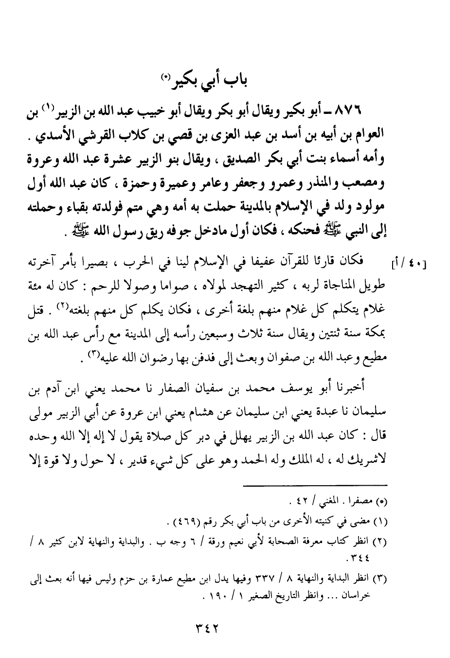 876- أبو بكير ، وَيُقَال : أبو بكر ، وَيُقَال : أبو خبيب عبد الله بن الزبير بن العوام بن أبيه بن أسد بن عبد العزى بن قصي بن كلاب القرشي الأسدي.