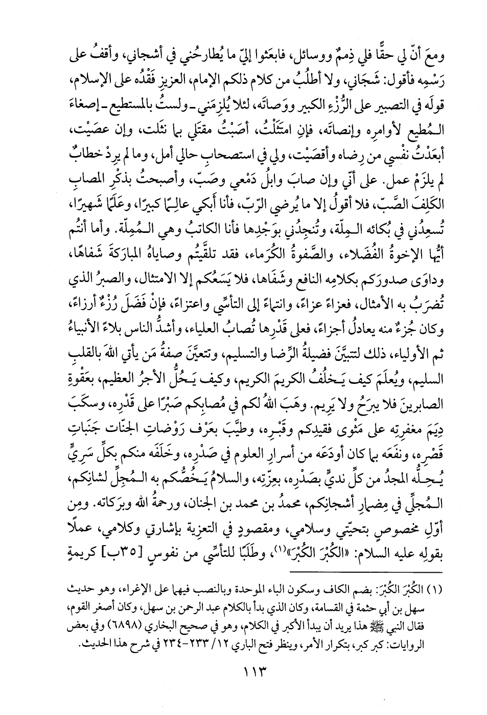 ومعَ أنّ لي حقًّا فلي ذِممٌ ووسائل، فابعَثوا إليّ ما يُطارحُني في أشجاني، وأقفُ على رَسْمِه فأقول: شَجَاني، ولا أطلُبُ من كلام ذلكم الإِمام، العزيزِ فَقْدُه على الإسلام، قولَه في التصبير على الرُّزْءِ الكبير ووَصاتَه، لئلا يُلزِمَني -ولستُ بالمستطيع- إصغاءَ المُطيع لأوامره وإنصاتَه، فإنِ امتَثَلْتُ، أصَبْتُ مقتَلي بما نثَلت، وإن عصيْت، أبعَدْتُ نفْسي من رِضاه وأقصَيْت، ولي في استصحابِ حالي أمل، وما لم يرِدْ خطابٌ لم يلزَمْ عمل. على أنّي وإن صابَ وابلُ دَمْعي وصَبّ، وأصبحتُ بذكْرِ المصابِ الكَلِفَ الصَّبّ، فلا أقولُ إلا ما يُرضي الرّبّ، فأنا أَبكي عالِمًا كبيرًا، وعَلَمًا شَهيرًا، تُسعِدُني في بُكائه المِلّة، وتُنجِدُني بوَجْدِها فأنا الكاتبُ وهي المُمِلّة. وأما أنتُم أيُّها الإخوةُ الفُضَلاء، والصَّفوةُ الكُرَماء، فقد تلقَّيتُم وصاياهُ المبارَكةَ شَفاهًا، وداوَى صدورَكم بكلامِه النافع وشَفَاها، فلا يَسَعُكم إلا الامتثال، والصبرُ الذي تُضرَبُ به الأمثال، فعزاءً عزاءً، وانتماءً إلى التأسِّي واعتزاءً، فإنْ فَضَلَ رُزْءٌ أرزاءً، وكان جُزءٌ منه يعادلُ أجزاءً، فعلى قَدْرِها تُصابُ العلياء، وأشدّ الناس بلاءً الأنبياءُ ثم الأولياء، ذلك لتتبيَّنَ فضيلةُ الرِّضا والتسليم، وتتعيَّنَ صفةُ مَن يأتي الله بالقلبِ السليم، وُيعلَمَ كيف يَخلُفُ الكريمَ الكريم، وكيف يَحُلُ الأجرُ العظيم، بعَقْوةِ الصابرينَ فلا يبرَحُ ولا يَرِيم. وهَبَ اللهُ لكم في مُصابِكم صَبْرًا على قَدْرِه، وسكَبَ دِيَمَ مغفرِتِه على مَثْوى فقيدِكم وقَبْرِه، وطيَّبَ بعَرْف رَوْضاتِ الجنّات جَنَباتِ قَصرِه، ونفَعَه بما كان أودَعَه من أسرارِ العلوم في صَدْرِه، وخَلَفَه منكم بكلِّ سَرِيٍّ يُحِلّه المجدُ من كلِّ نديٍّ بصَدْرِه، بعِزّتِه، والسلامُ يَخُصُّكم به المُجِلِّ لشانِكم، المُجلِّي في مِضمارِ أشجانِكم، محمدُ بن محمد بن الجنان، ورحمةُ الله وبرَكاته. ومن أوّلِ مخصوصٍ بتحيّتي وسلامي، ومقصودٍ في التعزِية بإشارتي وكلامي، عملًا بقولِه عليه السلام: "الكُبْرَ الكُبْرَ" (¬1)، وطَلَبًا للتأسِّي من نفوسٍ [35 ب] كريمةٍ