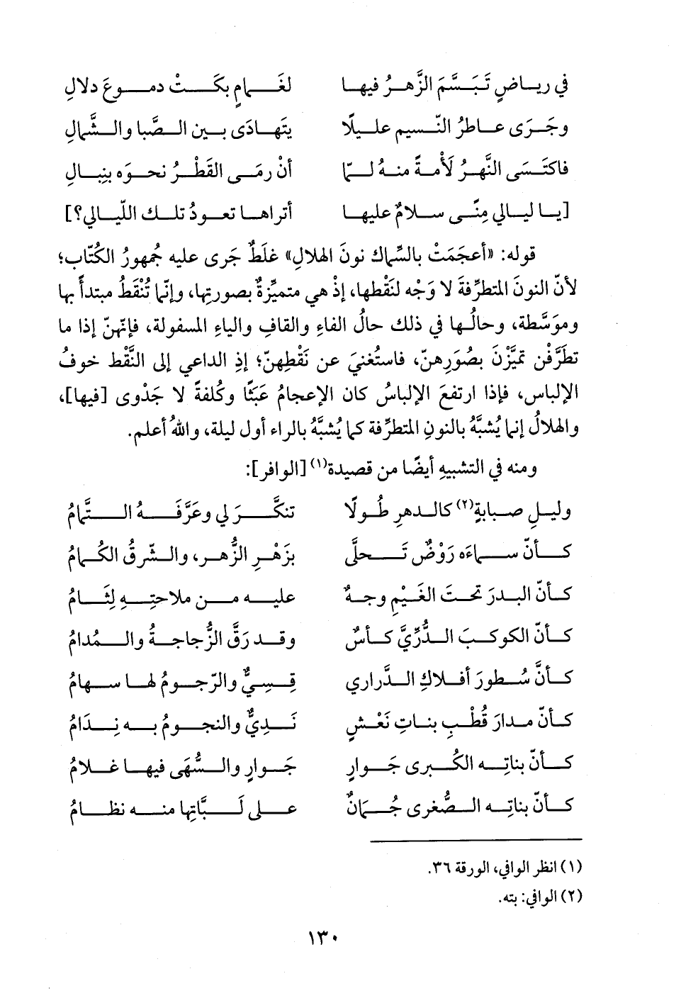 قوله: "أعجَمَتْ بالسِّماك نونَ الهلالِ" غلَطٌ جَرى عليه جُمهورُ الكُتّاب؛ لأنّ النونَ المتطرِّفةَ لا وَجْه لنَقْطها، إذْ هي متميِّزةٌ بصورتِها، وإنّما تُنْقَطُ مبتدأً بها وموَسَّطة، وحالُها في ذلك حالُ الفاءِ والقافِ والياءِ المسفولة، فإنّهنّ إذا ما تطَرَّفْن تميَّزْنَ بصُوَرِهنّ، فاستُغنيَ عن نَقْطِهنّ؛ إذِ الداعي إلى النَّقْط خوفُ الإلباس، فإذا ارتفعَ الإلباسُ كان الإعجامُ عَبَثًا وكُلفةً لا جَدْوى [فيها] , والهلالُ إنما يُشبَّهُ بالنونِ المتطرّفة كما يُشبَّهُ بالراء أول ليلة، واللهُ أعلم.