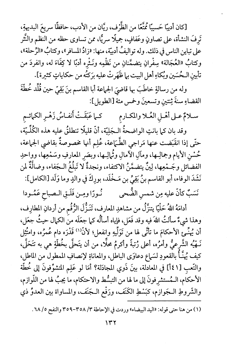 وقد بأن كما بانتِ الواضحةُ الجَلِيّة، أنّ قليلاً تنطلقُ عليه هذه الكُلِّيّة، حتّى إذا انقَبَضت عنها مَراجي الطَّمَاعة، عُلِم أنها مخصوصةٌ بقاضي الجماعة، حُسْنِ الأيام وجمالِها، ومآلِ الآمالِ وثُمالِها، وبصَرِ المعارفِ وسَمْعِها، وواحدِ الفضائل وجَمْعِها, لِينٌ يتضمَّنُ الاكتفاء، ونجدةٌ لا تَبلُغُ الجَفاء، وضالَّةٌ لمن نَشَدَ الوفاء، أبو القاسم بنُ بَقِيِّ بن مَخْلَد، بورِكَ في والدٍ وما وَلَد [الكامل]: