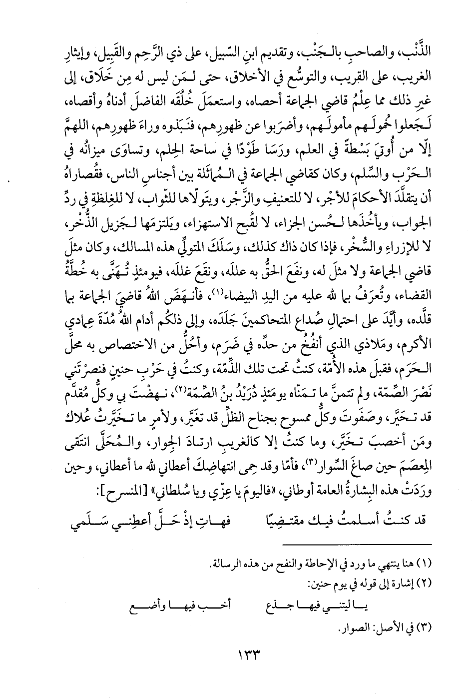 الذَّنْب، والصاحبِ بالجَنْب، وتقديم ابنِ السّبيل، على ذي الرَّحِم والقَبِيل، وإيثارِ الغريب، على القريب، والتوسُّع في الأخلاق، حتى لمَن ليس له مِن خَلَاق، إلى غير ذلك مما عِلْمُ قاضي الجماعة أحصاه، واستعمَلَ خُلُقَه الفاضلَ أدناهُ وأقصاه، لَجَعلوا خُمولَهم مأمولَهم، وأضرَبوا عن ظهورِهم، فنَبَذوه وراءَ ظهورِهم، اللهمَّ إلا من أُوتيَ بَسْطةً في العلم، ورَسَا طَوْدًا في ساحة الحِلم، وتساوَى ميزانُه في الحَرْب والسِّلم، وكان كقاضي الجماعة في المُماثَلة بين أجناسِ الناس، فقُصاراهُ أن يتقلَّدَ الأحكامَ للأجْر، لا للتعنيفِ والزَّجْر، ويتَولّاها للثّواب، لا للغِلظةِ في ردِّ الجواب، ويأخُذَها لحُسن الجزاء، لا لقُبح الاستهزاء، ويَلتزمَها لجَزيل الذُّخْر، لا للإزراءِ والسُّخْر، فإذا كان ذاك كذلك، وسَلَكَ المتولِّي هذه المسالك، وكان مثلَ قاضي الجماعة ولا مثلَ له، ونفَعَ الحقُّ به عللَه، ونقَعَ غللَه، فيومئذٍ تُهَنَّى به خُطَّةُ القضاء، وتُعرَفُ بما لله عليه من اليدِ البيضاء (¬1)، فأنهَضَ اللهُ قاضيَ الجماعة بما قلَّده، وأيَّدَ على احتمالِ صُداع المتحاكمينَ جَلَدَه، وإلى ذلكُم أدام اللهُ مُدّةَ عِمادي الأكرم، ومَلاذي الذي أنفُخُ من حدِّه في ضرَم، وأحُلُّ من الاختصاص به محلَّ الحَرَم، فقبلَ هذه الأُمّة، كنتُ تحت تلك الذِّمّة، وكنتُ في حَرْبِ حنين فنصرْتَني نَصْرَ الصمّة، ولِم تتمنَّ ما تمَنّاه يومَئذٍ دُرَيْدُ بنُ الصِّمّة (¬2)، نهضْتَ بي وكلُّ مُقدَّم قد تحَيَّر، وصَفوتَ وكلُّ ممسوح بجناح الظلِّ قد تغَيَّر، ولأمرٍ ما تخَيَّرتُ عُلاك ومَن أخصبَ تخَيَّر، وما كنتُ إلا كالغريبِ ارتادَ الجِوار، والمُحَلَّى انتَقى المِعصَمَ حين صاغَ السِّوار (¬3)، فأمّا وقد حِمى انتهاضِكَ أعطاني لله ما أعطاني، وحين ورَدَتْ هذه البِشارةُ العامة أوطاني، "فاليومَ يَا عِزّي ويا سُلطاني" [المنسرح]: