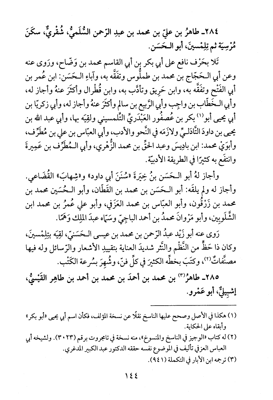 284 - طاهرُ بن عليّ بن محمد بن عبدِ الرّحمن السُّلَمي، شُقْريٌّ، سكَنَ مُرْسِيَة ثم تِلِمْسينَ، أبو الحَسَن.