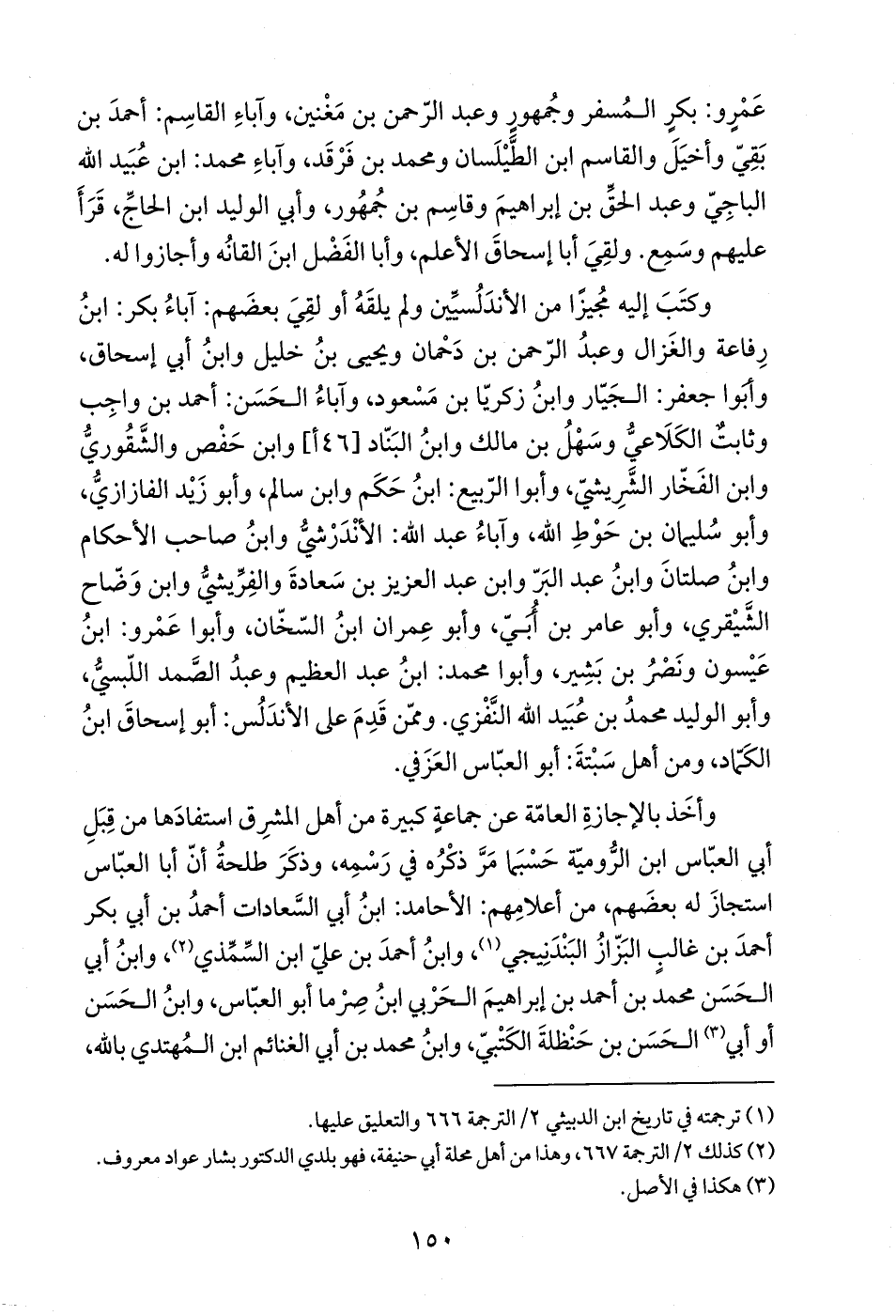 وكتَبَ إليه مجُيزًا من الأندَلُسيِّين ولم يلقَهُ أو لقِيَ بعضَهم: آباءُ بكر: ابنُ رِفاعة والغَزال وعبدًالرّحمن بن دَحْمان ويحيى بنُ خليل وابنُ أبي إسحاق، وأبَوا جعفر: الجَيّار وابنُ زكريّا بن مَسْعود، وآباءُ الحَسَن: أحمد بن واجِب وثابت الكَلَاعيُّ وسَهْلُ بن مالك وابنُ البَنّاد [46 أ] وابن حَفْص والشَّقُوريُّ وابن الفَخّار الشَّرِيشيّ، وأبوا الرّبيع: ابنُ حَكَم وابن سالم، وأبو زَيْد الفازازيُّ، وأبو سُليمان بن حَوْطِ الله، وآباءُ عبد الله: الأنْدَرْشيُّ وابنُ صاحب الأحكام وابنُ صلتانَ وابنُ عبد البَرّ وابن عبد العزيز بن سَعادةَ والفِرِّيشيُّ وابن وَضّاح الشَّيْقري، وأبو عامر بن أُبَيّ، وأبو عِمران ابنُ السّخّان، وأبوا عَمْرو: ابنُ عَيْسون ونَصْرُ بن بَشِير، وأبوا محمد: ابنُ عبد العظيم وعبدُ الصَّمد اللّبسيُّ، وأبو الوليد محمدُ بن عُبَيد الله النَّفْزي. وممّن قَدِمَ على الأندَلُس: أبو إسحاقَ ابنُ الكَمّاد، ومن أهل سَبْتةَ: أبو العبّاس العَزَفي.