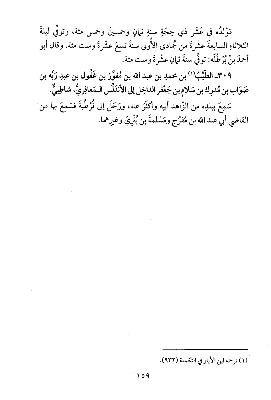 309 - الطّيِّبُ (¬1) بن محمدِ بن عبد الله بن مُفوَّز بن غَفُول بن عبدِ رَبِّه بن صَوَاب بن مُدرِك بن سَلام بن جَعْفر الداخِل إلى الأندَلُس المَعافِريُّ، شاطِبيٌّ.