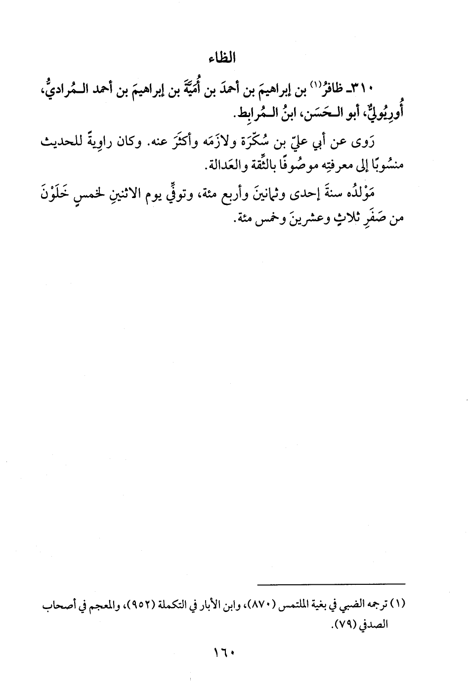 310 - ظافرُ (¬1) بن إبراهيمَ بن أحمدَ بن اُمَيَّةَ بن إبراهيمَ بن أحمد المُراديُّ، أُورِيُوليٌّ، أبو الحَسَن، ابنُ المُرابِط.