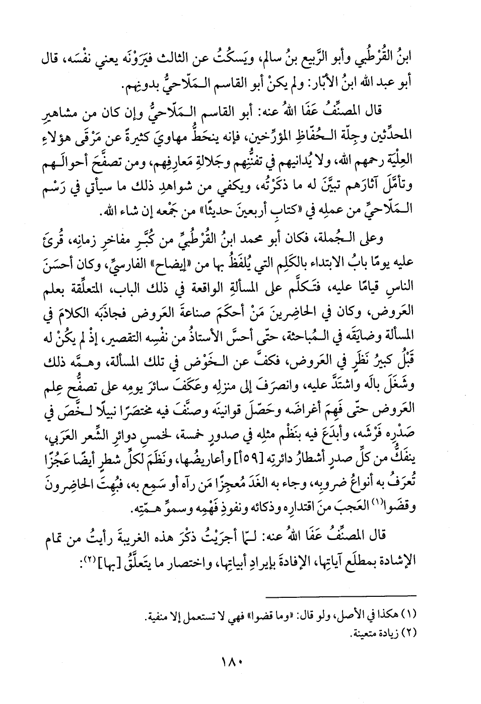 وعلى الجُملة، فكان أبو محمد ابنُ القُرْطُبيِّ من كُبَّرِ مفاخرِ زمانِه، قُرئَ عليه يومًا بابُ الابتداء بالكَلِم التي يُلفَظُ بها من "إيضاح" الفارسيِّ، وكان أحسَنَ الناسِ قيامًا عليه، فتَكلَّم على المسألةِ الواقعة في ذلك الباب، المتعلِّقة بعلم العَروض، وكان في الحاضِرينَ مَنْ أحكَمَ صناعةَ العَروض فجاذَبَه الكلامَ في المسألة وضايَقَه في المُباحثة، حتّى أحسَّ الأستاذُ من نفْسِه التقصير، إذْ لم يكُنْ له قَبْلُ كبيرُ نَظَرٍ في العَروض، فكفَّ عن الخَوْض في تلك المسألة، وهمَّه ذلك وشَغَلَ بالَه واشتَدَّ عليه، وانصرَفَ إلى منزلِه وعَكَفَ سائرَ يومِه على تصفُّح عِلم العَروض حتّى فَهِمَ أغراضَه وحَصّلَ قوانينَه وصنَّفَ فيه مختصَرًا نبيلًا لخَّصَ في صَدْرِه فَرْشَه، وأبدَعَ فيه بنَظْم مثلِه في صدورٍ خمسة، لخمسِ دوائرِ الشِّعر العَرَبي، ينفَكُّ من كلِّ صدرٍ أشطارُ دائرتِه [59 أ] وأعاريضُها، ونَظَمَ لكلِّ شطرٍ أيضًا عَجُزًا تُعرَفُ به أنواعُ ضروبِه، وجاء به الغَدَ مُعجِزًا مَن رآه أو سَمِع به، فبُهِتَ الحاضِرونَ وقضَوا (¬1) العَجبَ منَ اقتدارِه وذكائه ونفوذِ فَهْمِه وسموِّ همّتِه.