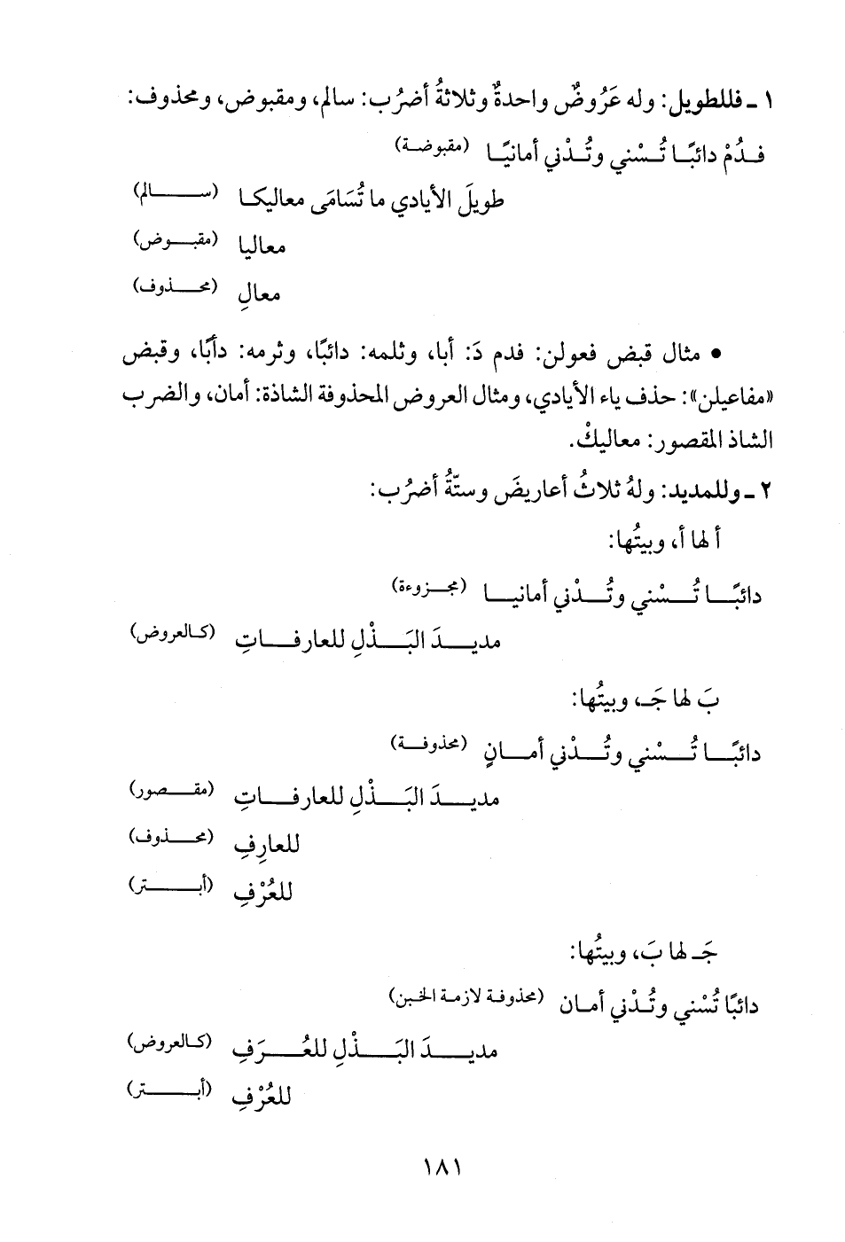 1 - فللطويل: وله عَرُوضٌ واحدةٌ وثلاثةُ أضرُب: سالم، ومقبوض، ومحذوف: فدُمْ دائبًا تُسْني وتُدْني أمانيًا (مقبوضة)