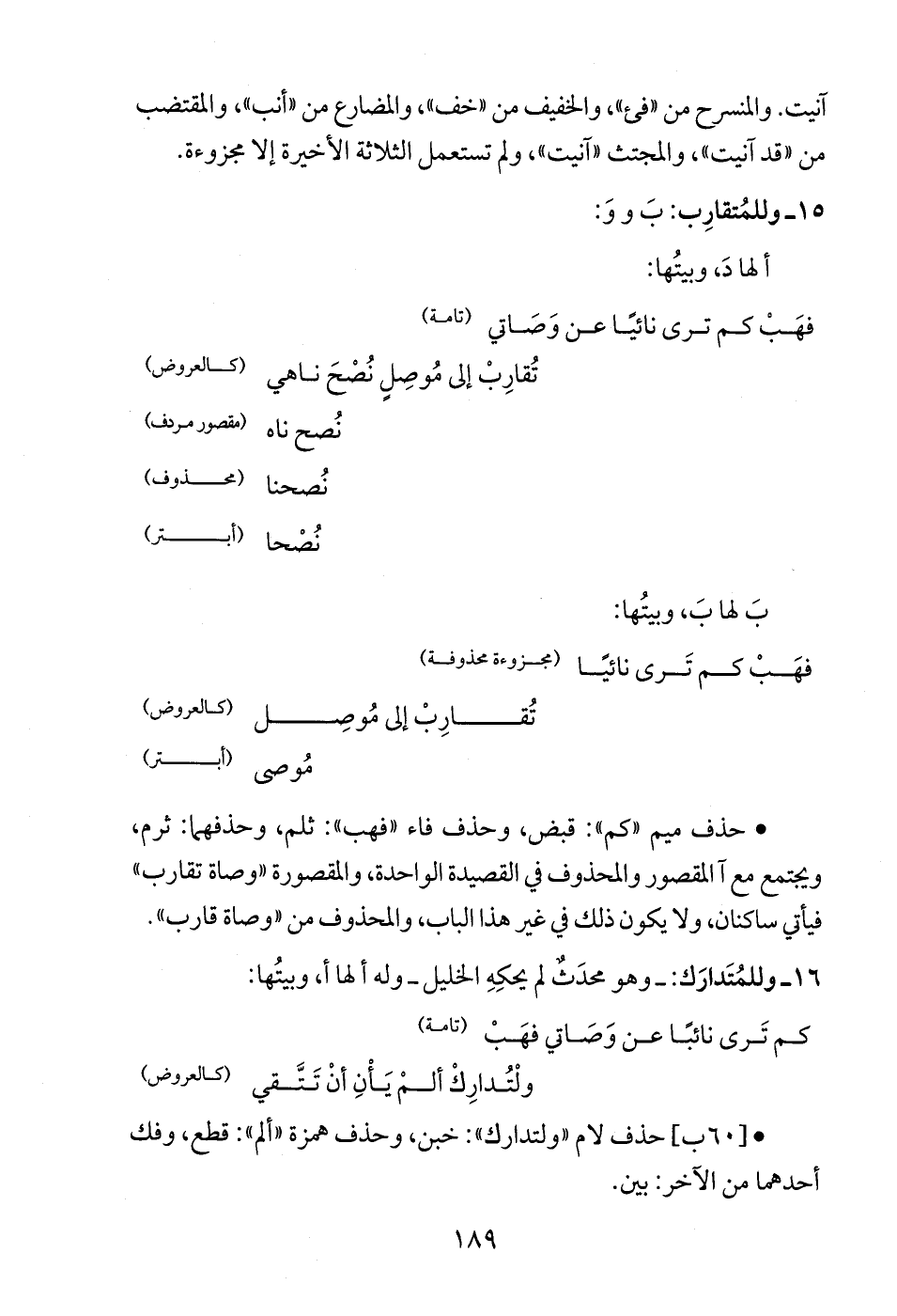 • حذف ميم "كم": قبض، وحذف فاء "فهب": ثلم، وحذفهما: ثرم، ويجتمع مع آالمقصور والمحذوف في القصيدة الواحدة، والمقصورة "وصاة تقارب" فيأتي ساكنان، ولا يكون ذلك في غير هذا الباب، والمحذوف من "وصاة قارب".