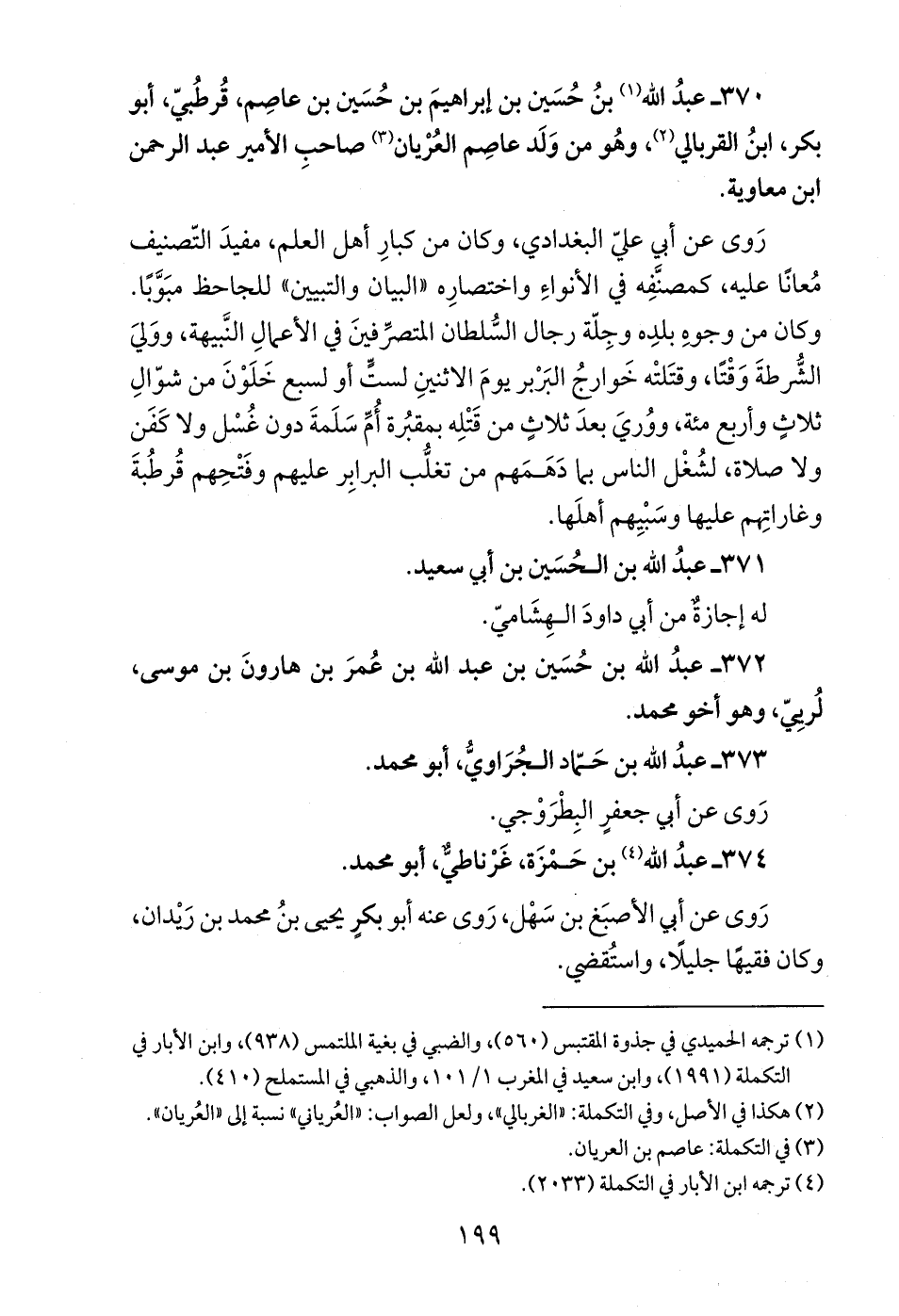 370 - عبدُ الله (¬1) بنُ حُسَين بن إبراهيمَ بن حُسَين بن عاصِم، قُرطُبيّ، أبو بكر، ابنُ القربالي (¬2)، وهُو من وَلَد عاصِم العُرْيان (¬3) صاحبِ الأمير عبد الرحمن أبن معاوية.