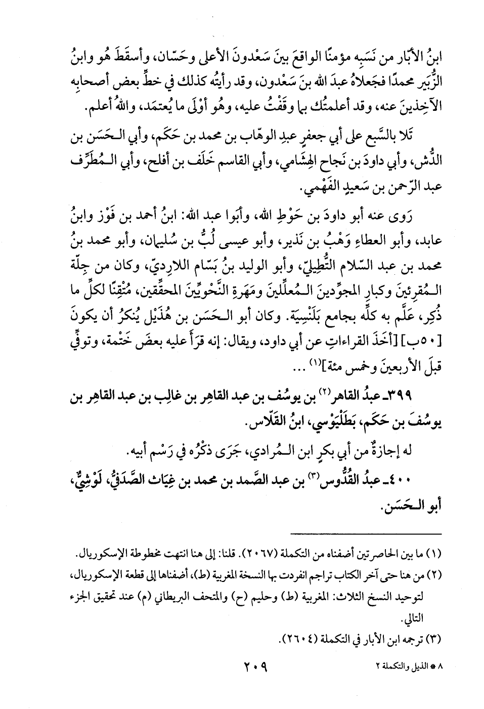 (¬2) من هنا حتى آخر الكتاب تراجم انفردت بها النسخة المغربية (ط)، أضفناها إلى قطعة الإسكوريال، لتوحيد النسخ الثلاث: المغربية (ط) وحليم (ح) والمتحف البريطاني (م) عند تحقيق الجزء التالي.