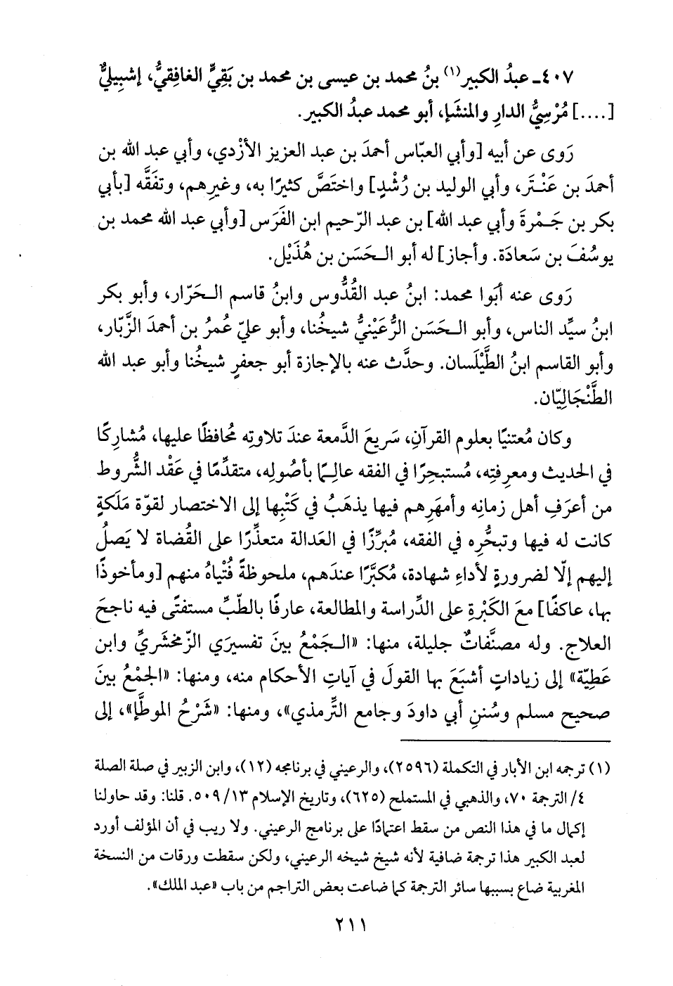 (¬1) ترجمه ابن الأبار في التكملة (2596)، والرعيني في برنامجه (12)، وابن الزبير في صلة الصلة 4/الترجمة 70، والذهبي في المستملح (625)، وتاريخ الإسلام 13/ 509. قلنا: وقد حاولنا إكمال ما في هذا النص من سقط اعتمادًا على برنامج الرعيني. ولا ريب في أن المؤلف أورد لعبد الكبير هذا ترجمة ضافية لأنه شيخ شيخه الرعيني، ولكن سقطت ورقات من النسخة المغربية ضاع بسببها سائر الترجمة كما ضاعت بعض التراجم من باب "عبد الملك".