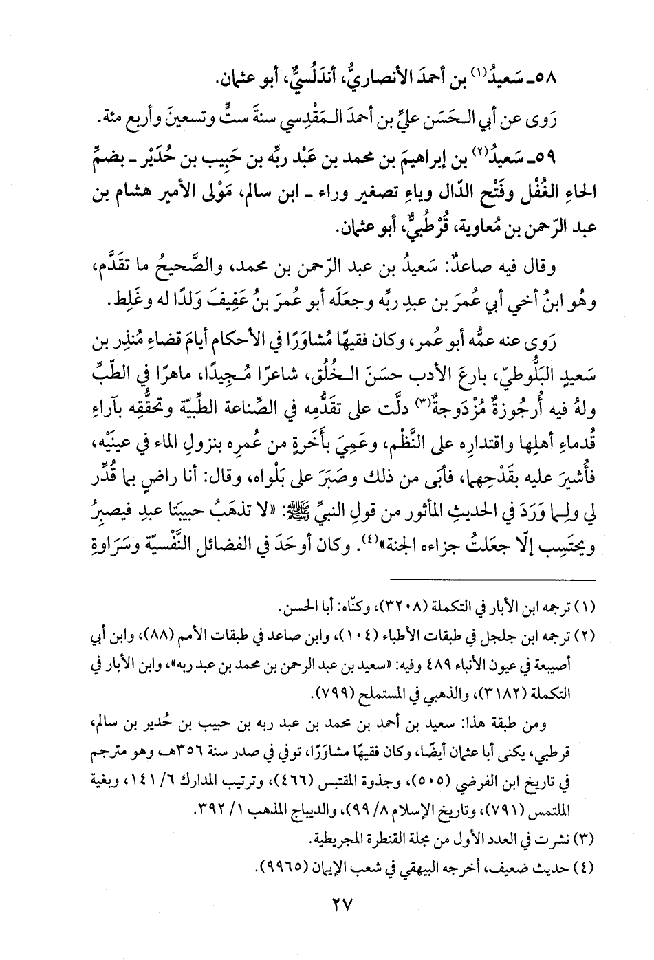 59 - سَعيدُ (¬2) بن إبراهيمَ بن محمد بن عَبْد ربِّه بن حَبِيب بن حُدَيْر -بضمِّ الحاءِ الغُفْل وفَتْح الدّال وياءِ تصغير وراء- ابن سالم، مَوْلى الأمير هشام بن عبد الرّحمن بن مُعاوية، قُرْطُبيٌّ، أبو عثمان.