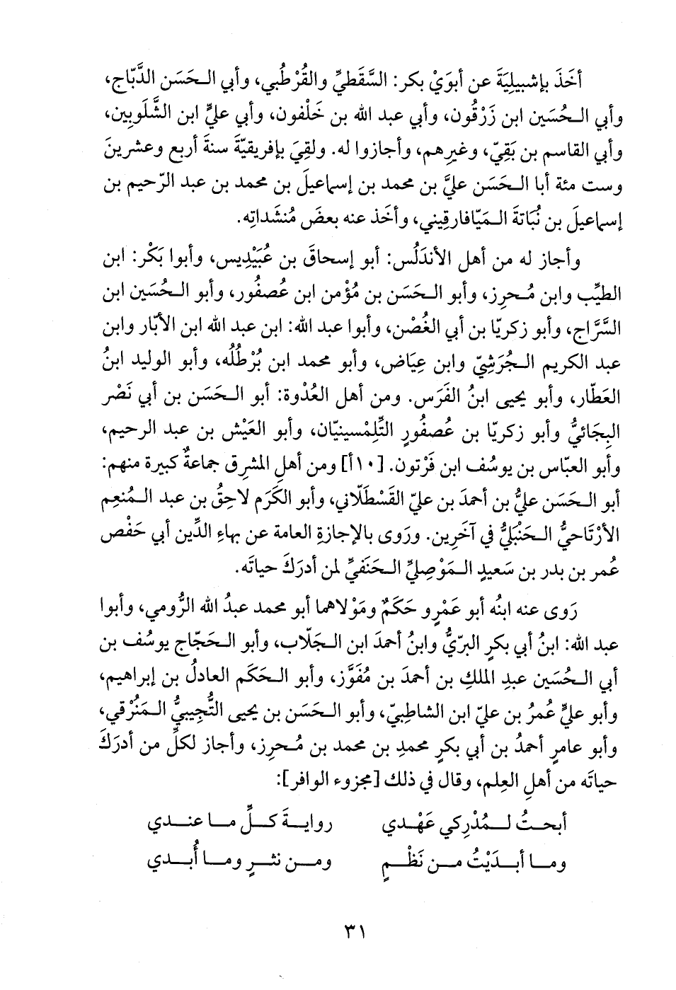 وأجاز له من أهل الأندَلُس: أبو إسحاقَ بن عُبَيْدِيس، وأبوا بَكْر: ابن الطيِّب وابن مُحرِز، وأبو الحَسَن بن مُؤْمن ابن عُصفُور، وأبو الحُسَين ابن السَّرَّاج، وأبو زكريّا بن أبي الغُصْن، وأبوا عبد الله: ابن عبد الله ابن الأبّار وابن عبد الكريم الجُرَشِيّ وابن عِيَاض، وأبو محمد ابن بُرْطُلُه، وأبو الوليد ابنُ العَطّار، وأبو يحيى ابنُ الفَرَس. ومن أهل العُدْوة: أبو الحَسَن بن أبي نَصْر البجَائيُّ وأبو زكريّا بن عُصفُورٍ التِّلِمْسينيّان، وأبو العَيْش بن عبد الرحيم، وأَبو العبّاس بن يوسُف ابن فَرْتون. [10 أ] ومن أهلِ المشرِق جماعةٌ كبيرة منهم: أبو الحَسَن عليُّ بن أحمدَ بن عليّ القَسْطَلّاني، وأبو الكَرَم لاحِقُ بن عبد المُنعِم الأرْتَاحيُّ الحَنْبَليُّ في آخَرِين. ورَوى بالإجازة العامة عن بهاءِ الدِّين أبي حَفْص عُمر بن بدر بن سَعيدٍ المَوْصِليِّ الحَنَفيِّ لمن أدرَكَ حياتَه.