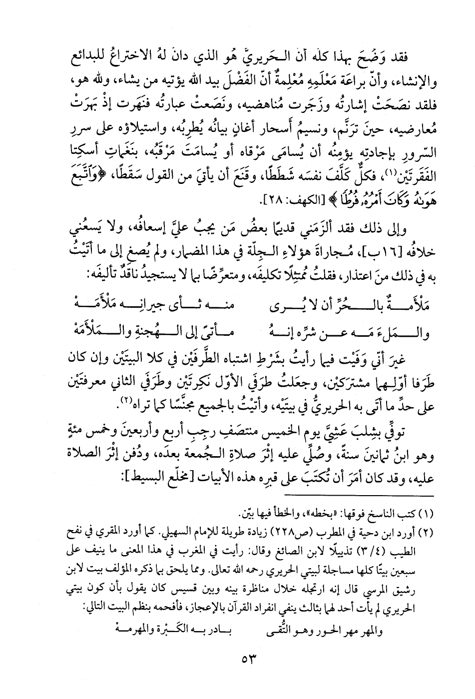 (¬2) أورد ابن دحية في المطرب (ص 228) زيادة طويلة للإمام السهيلي. كما أورد المقري في نفح الطيب (3/ 4) تذييلًا لابن الصائغ وقال: رأيت في المغرب في هذا المعنى ما ينيف على سبعين بيتًا كلها مساجلة لبيتي الحريري رحمه الله تعالى. ومما يلحق بما ذكره المؤلف بيت لابن رشيق المرسي قال إنه ارتجله خلال مناظرة بينه وبين قسيس كان يقول بأن كون بيتي الحريري لم يأت أحد لهما بثالث ينفي انفراد القرآن بالإعجاز، فأفحمه بنظم البيت التالي: