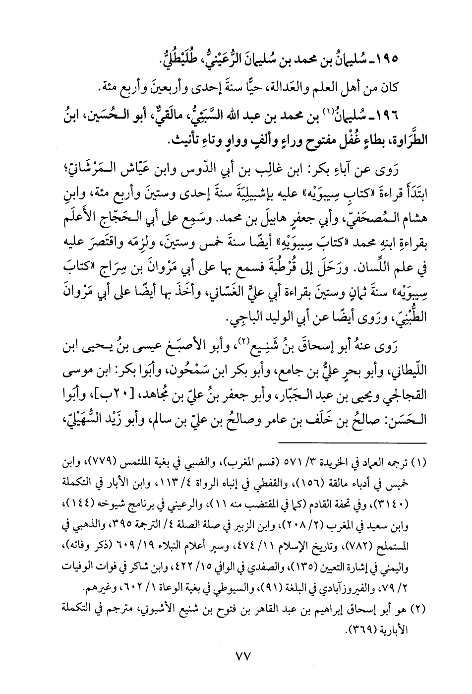 196 - سُليمانُ (¬1) بن محمد بن عبد الله السَّبَئِيُّ، مالَقيٌّ، أبو الحُسَين، ابنُ الطَّرَاوة، بطاءٍ غُفْل مفتوح وراءٍ وألفٍ وواوٍ وتاءِ تأنيث.