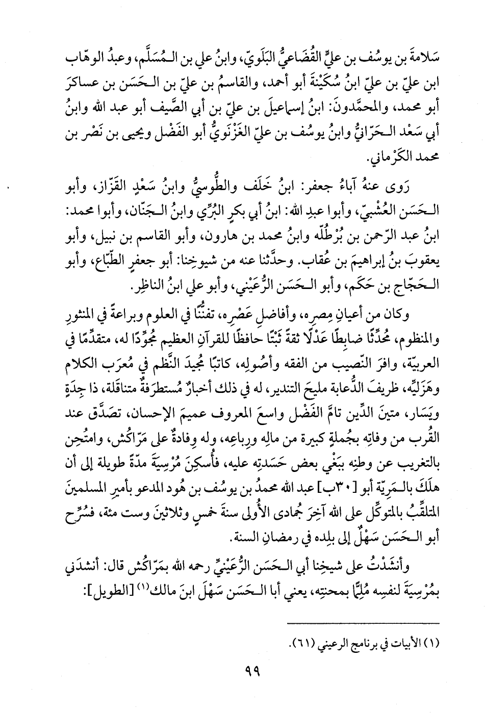 وأنشَدْتُ على شيخِنا أبي الحَسَن الرُّعَيْنيِّ رحمه الله بمَرّاكُش قال: أنشدَني بمُرْسِيَةَ لنفسِه مُلِمًّا بمحنتِه، يعني أَبا الحَسَن سَهْلَ ابنَ مالك (¬1) [الطويل]: