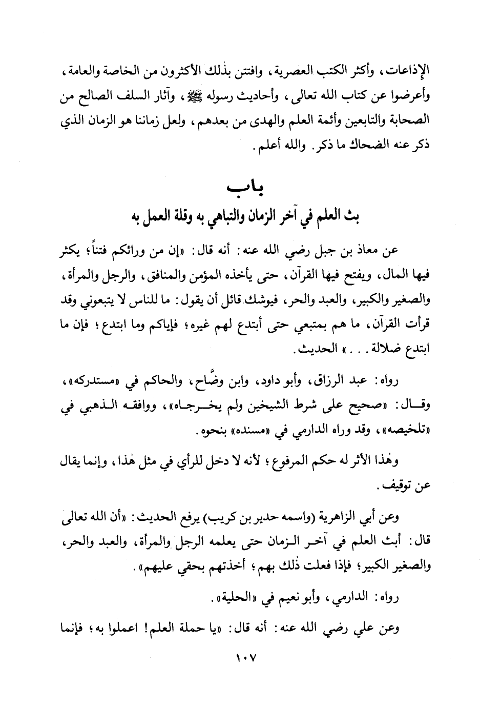 وعن أبي الزاهرية (واسمه حدير بن كريب) يرفع الحديث: «أن الله تعالى قال: أبث العلم في آخر الزمان حتى يعلمه الرجل والمرأة، والعبد والحر، والصغير والكبير؛ فإذا فعلت ذلك بهم؛ أخذتهم بحقي عليهم» .