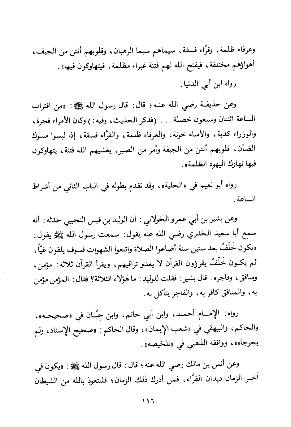وعن بشير بن أبي عمرو الخولاني: أن الوليد بن قيس التجيبي حدثه: أنه سمع أبا سعيد الخدري رضي الله عنه يقول: سمعت رسول الله صلى الله عليه وسلم يقول: «يكون خلف بعد ستين سنة أضاعوا الصلاة واتبعوا الشهوات فسوف يلقون غيًا، ثم يكون خلف يقرؤون القرآن لا يعدو تراقيهم، ويقرأ القرآن ثلاثة: مؤمن، ومنافق، وفاجر. قال بشير: فقلت للوليد: ما هؤلاء الثلاثة؟ فقال: المؤمن مؤمن به، والمنافق كافر به، والفاجر يتأكل به.»