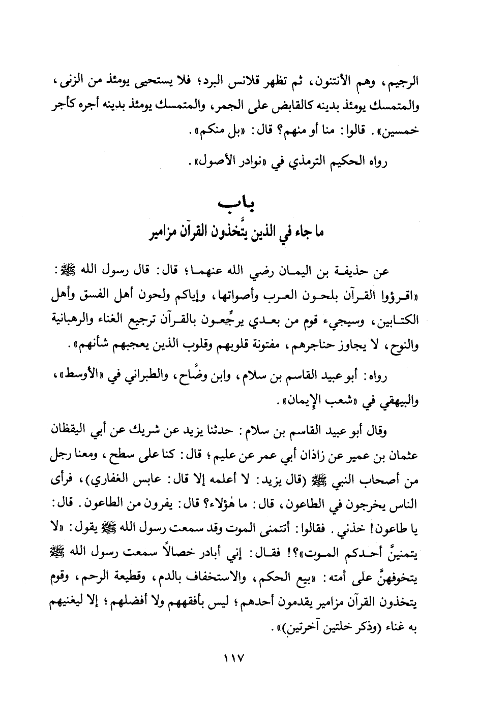 عن حذيفة بن اليمان رضي الله عنهما؛ قال: قال رسول الله صلى الله عليه وسلم: «اقرؤوا القرآن بلحون العرب وأصواتها، وإياكم ولحون أهل الفسق وأهل الكتابين، وسيجيء قوم من بعدي يرجعون بالقرآن ترجيع الغناء والرهبانية والنوح، لا يجاوز حناجرهم، مفتونة قلوبهم وقلوب الذين يعجبهم شأنهم» .
