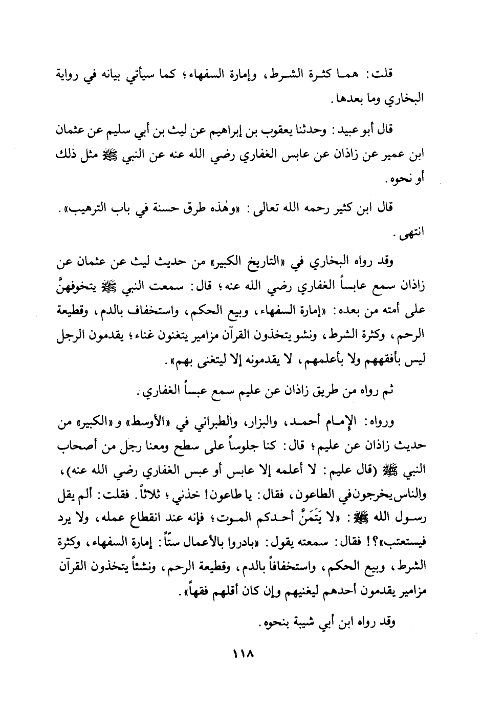 وقد رواه البخاري في "التاريخ الكبير" من حديث ليث عن عثمان عن زاذان سمع عابسًا الغفاري رضي الله عنه؛ قال: «سمعت النبي صلى الله عليه وسلم يتخوفهن على أمته من بعده: إمارة السفهاء، وبيع الحكم، واستخفاف بالدم، وقطيعة الرحم، وكثرة الشرط، ونشو يتخذون القرآن مزامير يتغنون غناء؛ يقدمون الرجل ليس بأفقههم ولا بأعلمهم، لا يقدمونه إلا ليتغنى بهم» .