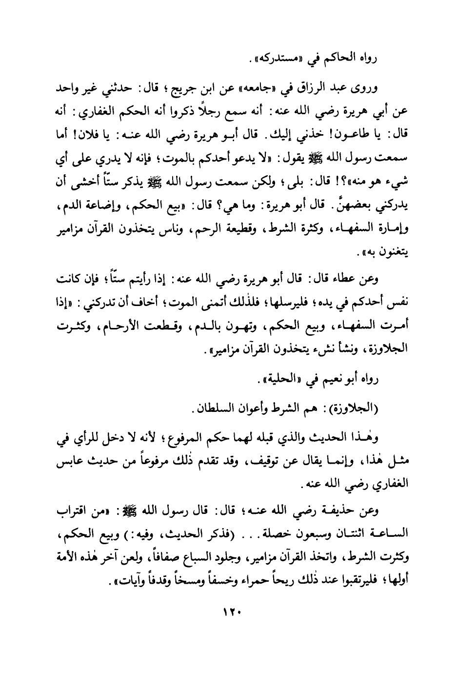 وعن عطاء قال: قال أبو هريرة رضي الله عنه: «إذا رأيتم ستًا؛ فإن كانت نفس أحدكم في يده؛ فليرسلها؛ فلذلك أتمنى الموت؛ أخاف أن تدركني: "إذا أمرت السفهاء، وبيع الحكم، وتهون بالدم، وقطعت الأرحام، وكثرت الجلاوزة، ونشأ نشء يتخذون القرآن مزامير» .
