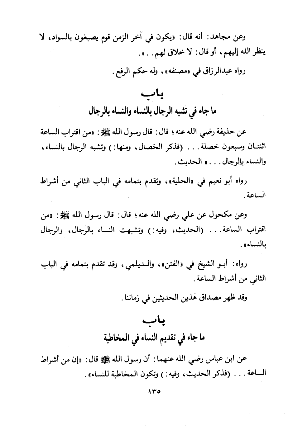 عن حذيفة رضي الله عنه؛ قال: قال رسول الله صلى الله عليه وسلم: «من اقتراب الساعة اثنتان وسبعون خصلة» .... (فذكر الخصال، ومنها:) «وتشبه الرجال بالنساء، والنساء بالرجال» .... الحديث.