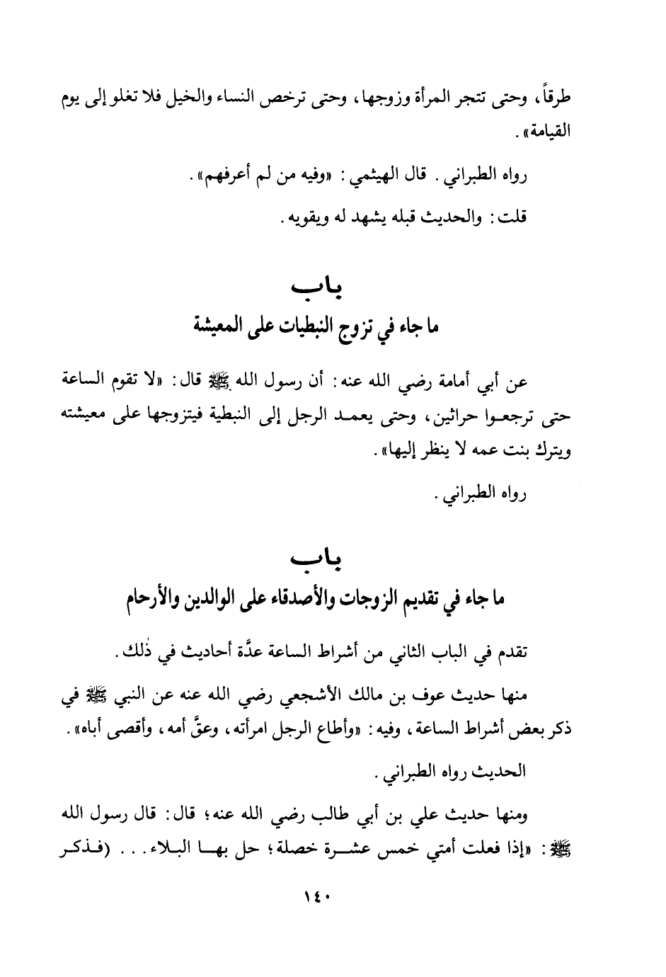 عن أبي أمامة رضي الله عنه: أن رسول الله صلى الله عليه وسلم قال: «لا تقوم الساعة حتى ترجعوا حراثين، وحتى يعمد الرجل إلى النبطية فيتزوجها على معيشته ويترك بنت عمه لا ينظر إليها» .