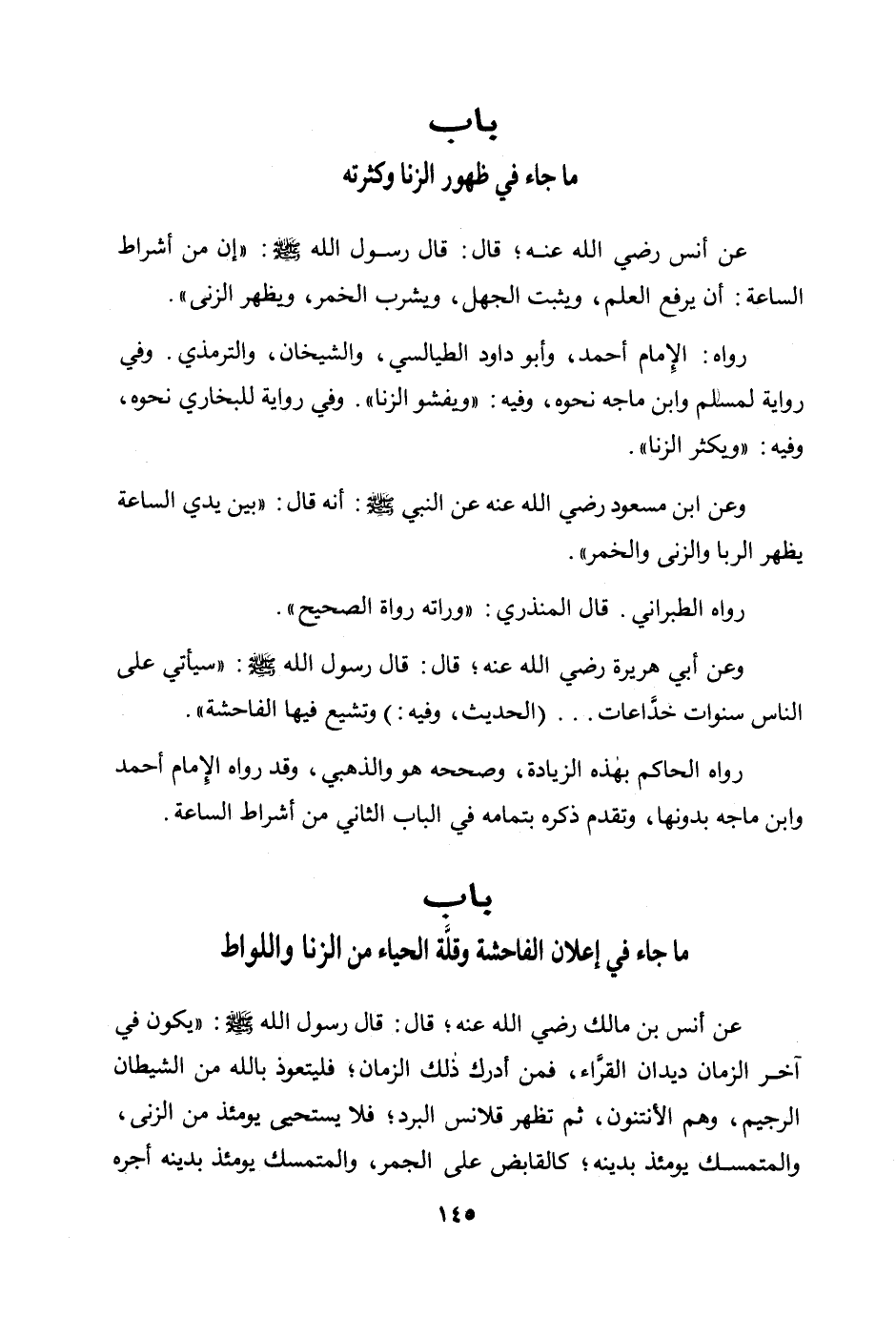 عن أنس؛ قال: قال رسول الله صلى الله عليه وسلم: «إن من أشراط الساعة: أن يرفع العلم، ويثبت الجهل، ويشرب الخمر، ويظهر الزنى» . رواه: الإمام أحمد، وأبو داود الطيالسي، والشيخان، والترمذي. وفي رواية لمسلم وابن ماجه نحوه، وفيه: «ويفشو الزنا» . وفي رواية للبخاري نحوه، وفيه: «ويكثر الزنا» .