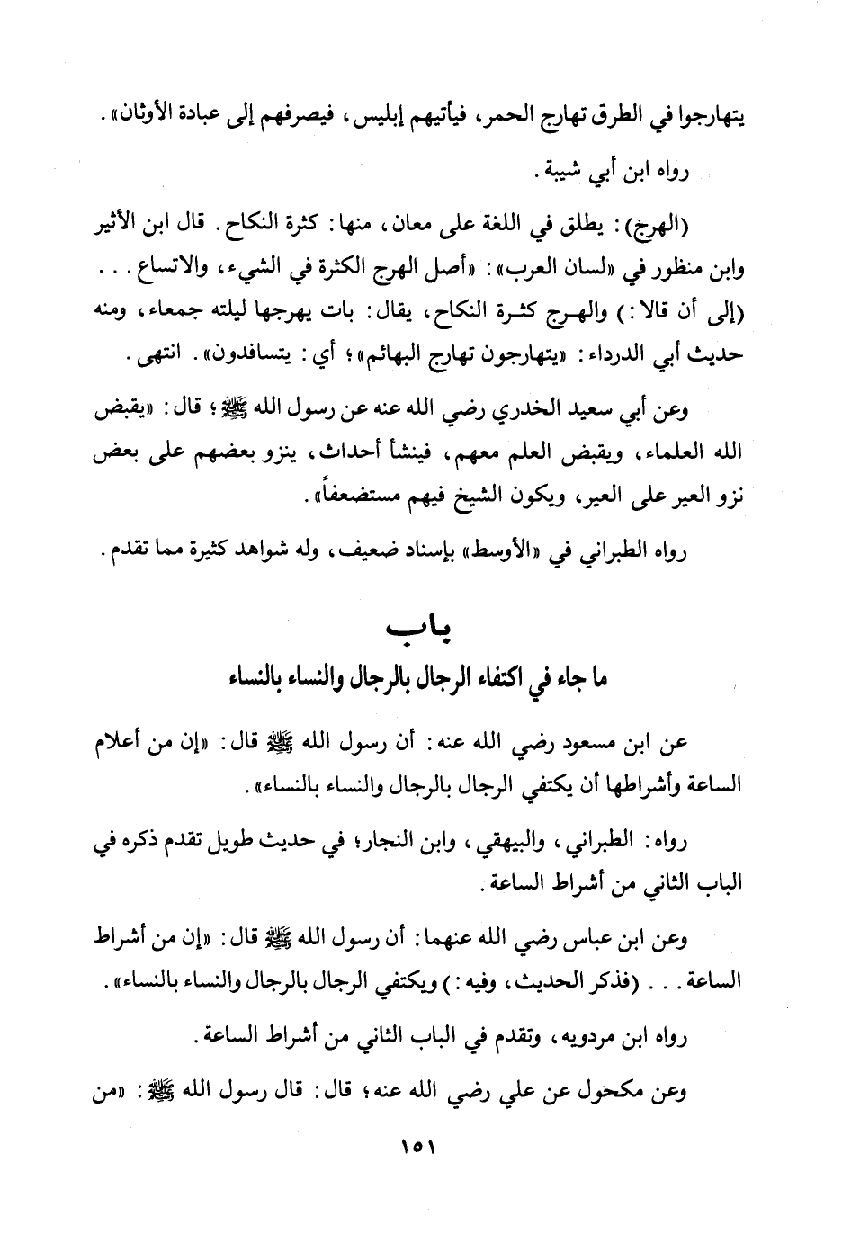 عن ابن مسعود رضي الله عنه: أن رسول الله صلى الله عليه وسلم قال: «إن من أعلام الساعة وأشراطها أن يكتفي الرجال بالرجال والنساء بالنساء» .