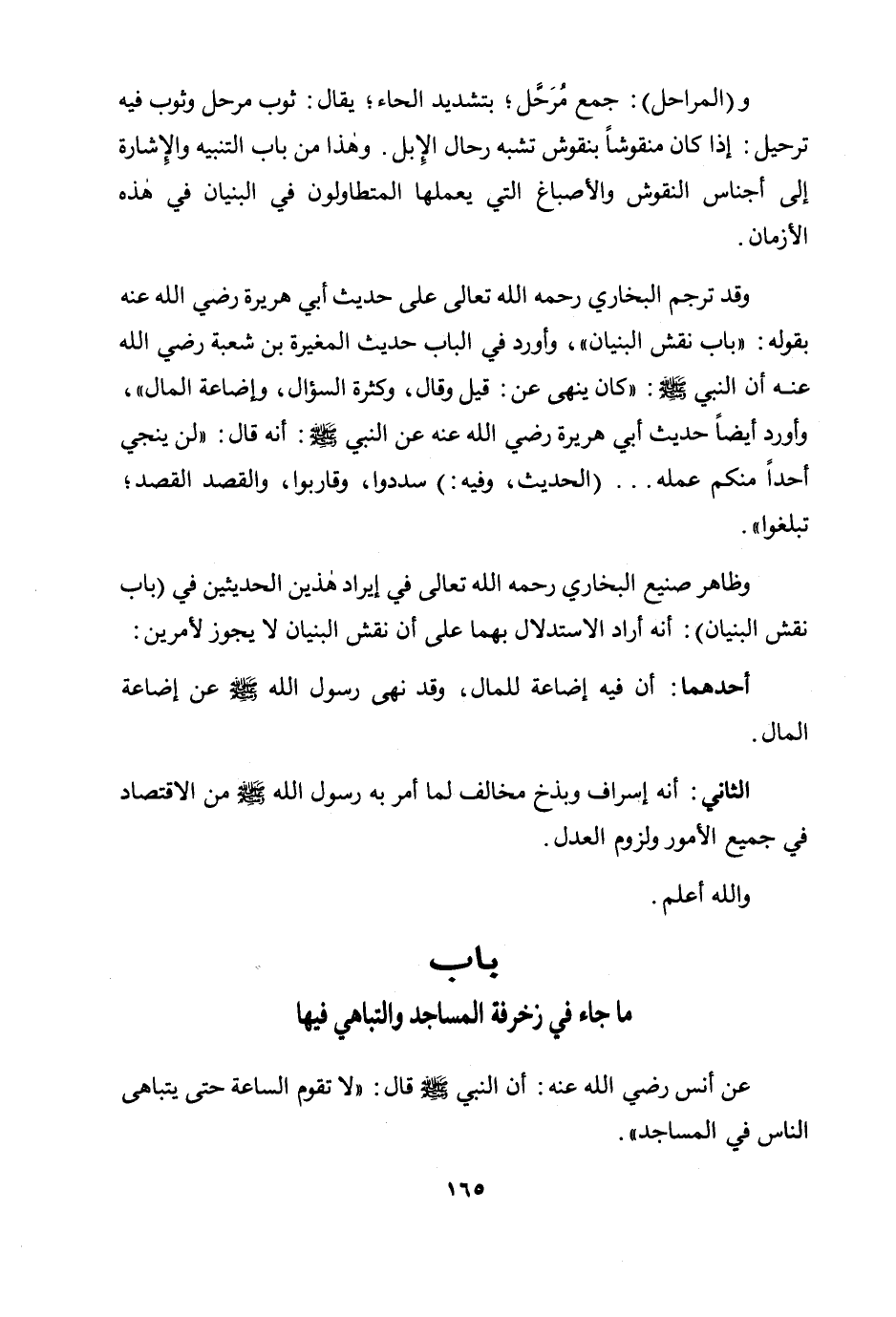 وقد ترجم البخاري رحمه الله تعالى على حديث أبي هريرة رضي الله عنه بقوله: "باب نقش البنيان"، وأورد في الباب حديث المغيرة بن شعبة رضي الله عنه أن النبي صلى الله عليه وسلم: «كان ينهى عن: قيل وقال، وكثرة السؤال، وإضاعة المال» ، وأورد أيضًا حديث أبي هريرة رضي الله عنه عن النبي صلى الله عليه وسلم: أنه قال: «لن ينجي أحدًا منكم عمله» ... (الحديث، وفيه:) «سددوا، وقاربوا، والقصد القصد؛ تبلغوا» .
