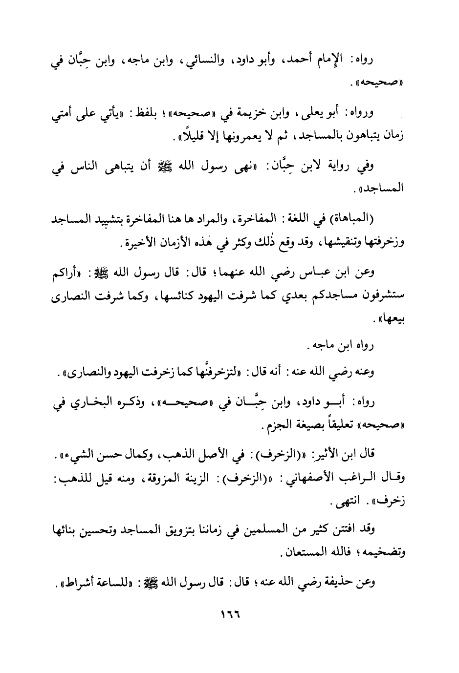 وعن ابن عباس رضي الله عنهما؛ قال: قال رسول الله صلى الله عليه وسلم: «أراكم ستشرفون مساجدكم بعدي كما شرفت اليهود كنائسها، وكما شرفت النصارى بيعها» .