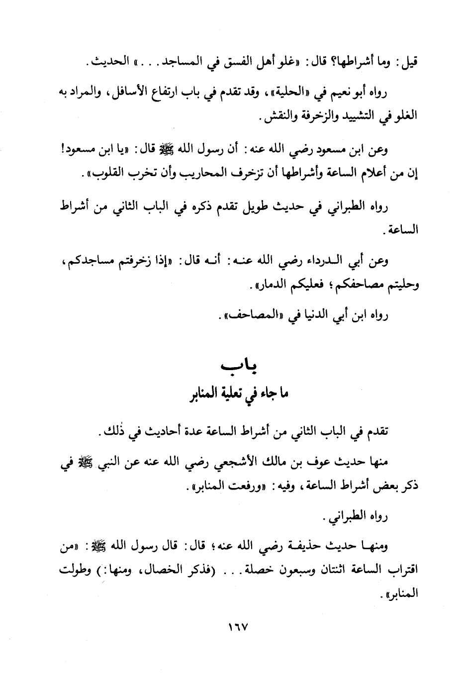 وعن ابن مسعود رضي الله عنه: أن رسول الله صلى الله عليه وسلم قال: «يا ابن مسعود! إن من أعلام الساعة وأشراطها أن تزخرف المحاريب وأن تخرب القلوب» .