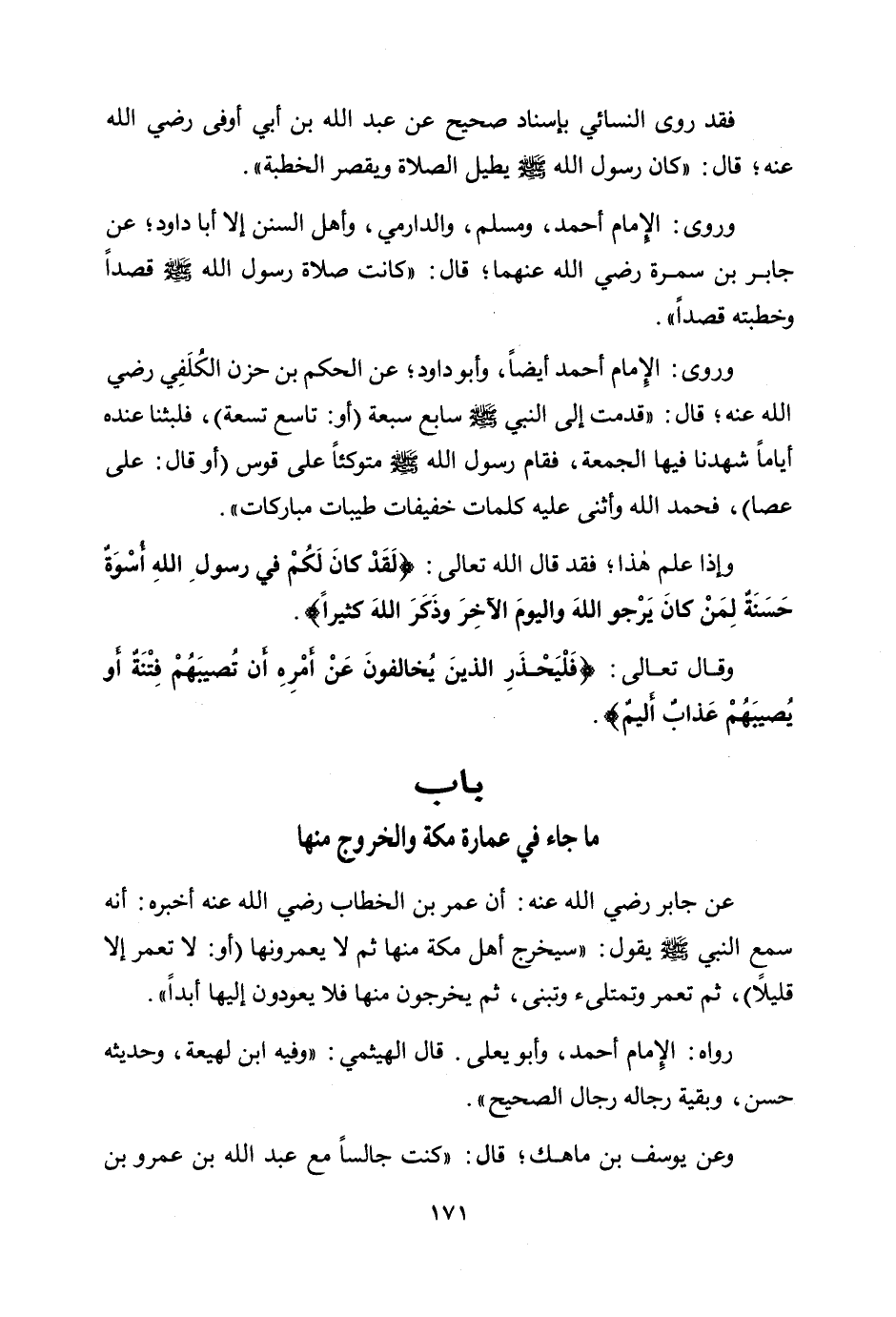 عن جابر رضي الله عنه: أن عمر بن الخطاب رضي الله عنه أخبره: أنه سمع النبي صلى الله عليه وسلم يقول: «سيخرج أهل مكة منها ثم لا يعمرونها (أو: لا تعمر إلا قليلًا) ، ثم تعمر وتمتلئ وتبنى، ثم يخرجون منها فلا يعودون إليها أبدًا» .